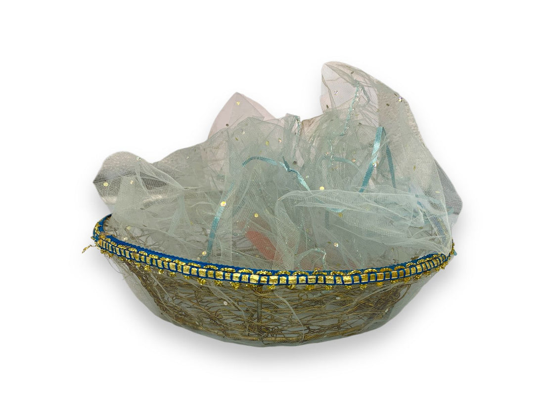 Festive Decorative Basket with Golden Lace Accents – Red, Blue & Orange