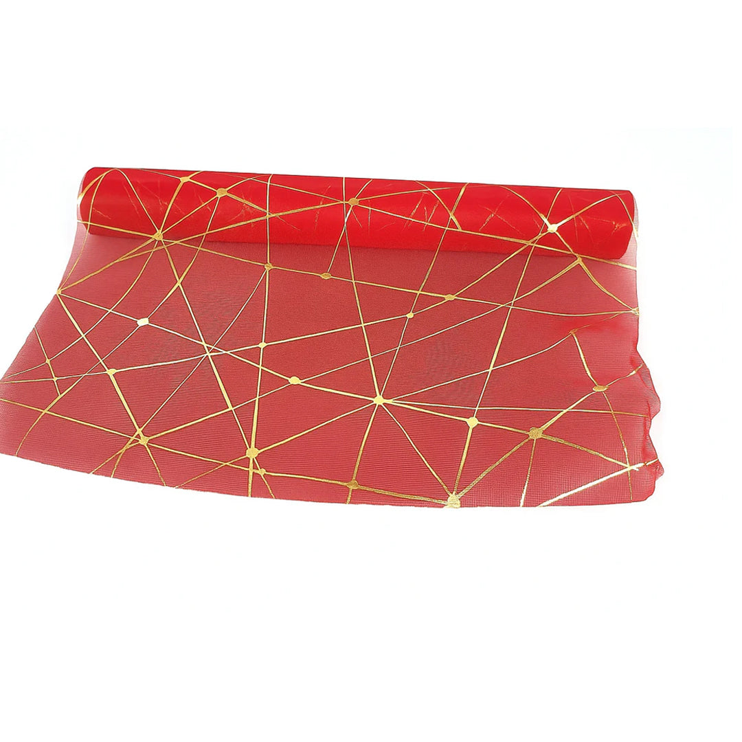 Add a luxurious touch to your décor and gifting with this Golden Blaze Design Net Roll. Designed with a rich red base and intricate golden geometric accents, this roll enhances any festive setup, event decoration, or creative craft project. The high-quality mesh fabric offers durability, flexibility, and a refined look, making it ideal for gift wrapping, floral arrangements, table runners, or DIY art. Perfect for weddings, parties, and seasonal celebrations.