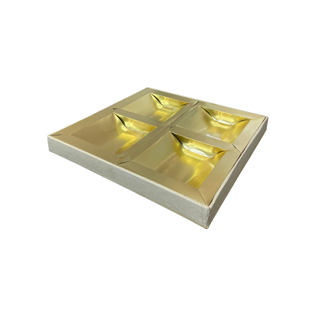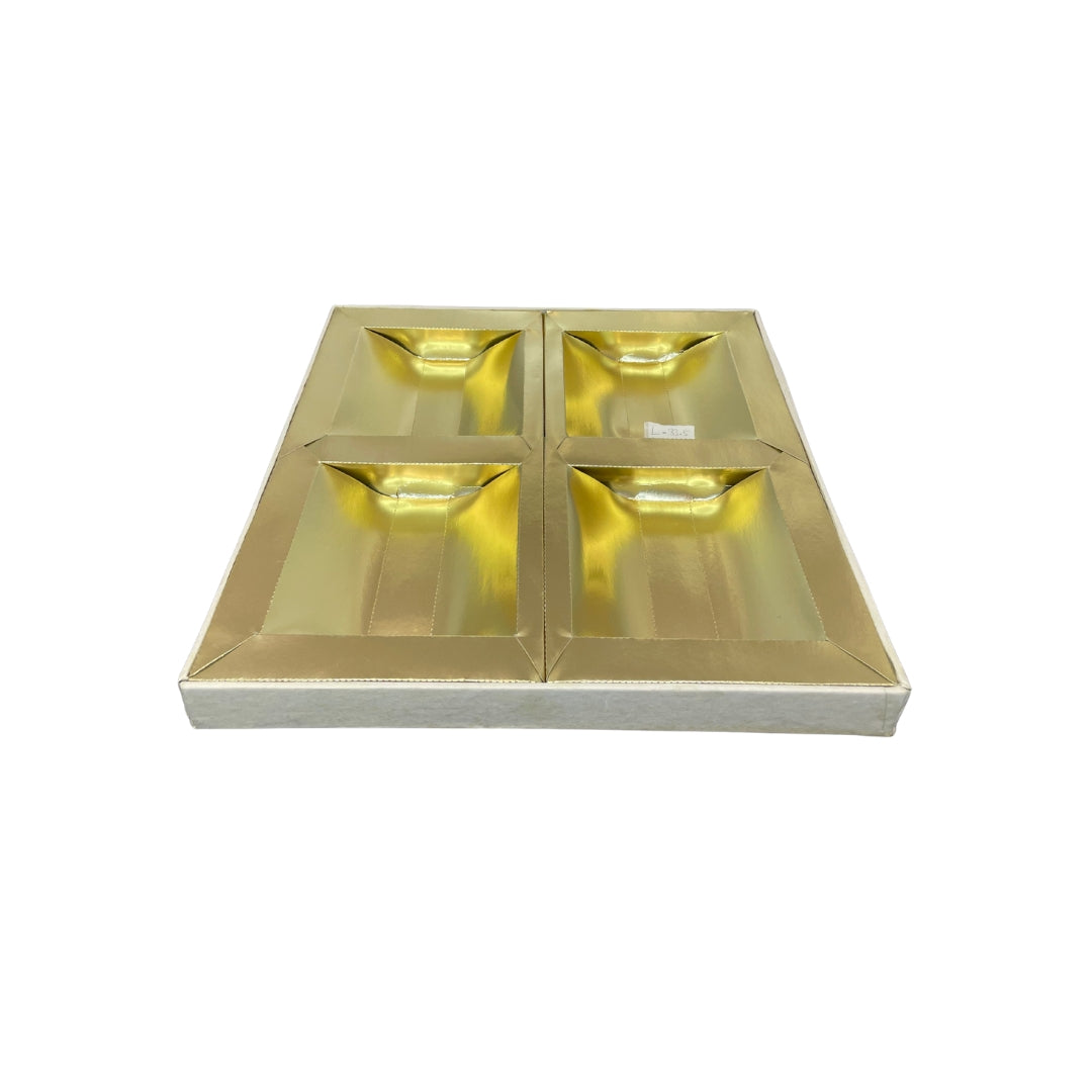 Crafted with high-quality materials, this box features four spacious golden compartments, perfectly suited for presenting dry fruits, chocolates, sweets, or assorted treats. Whether you’re gifting it to loved ones or clients, this premium box ensures your gifting stands out with elegance and class.