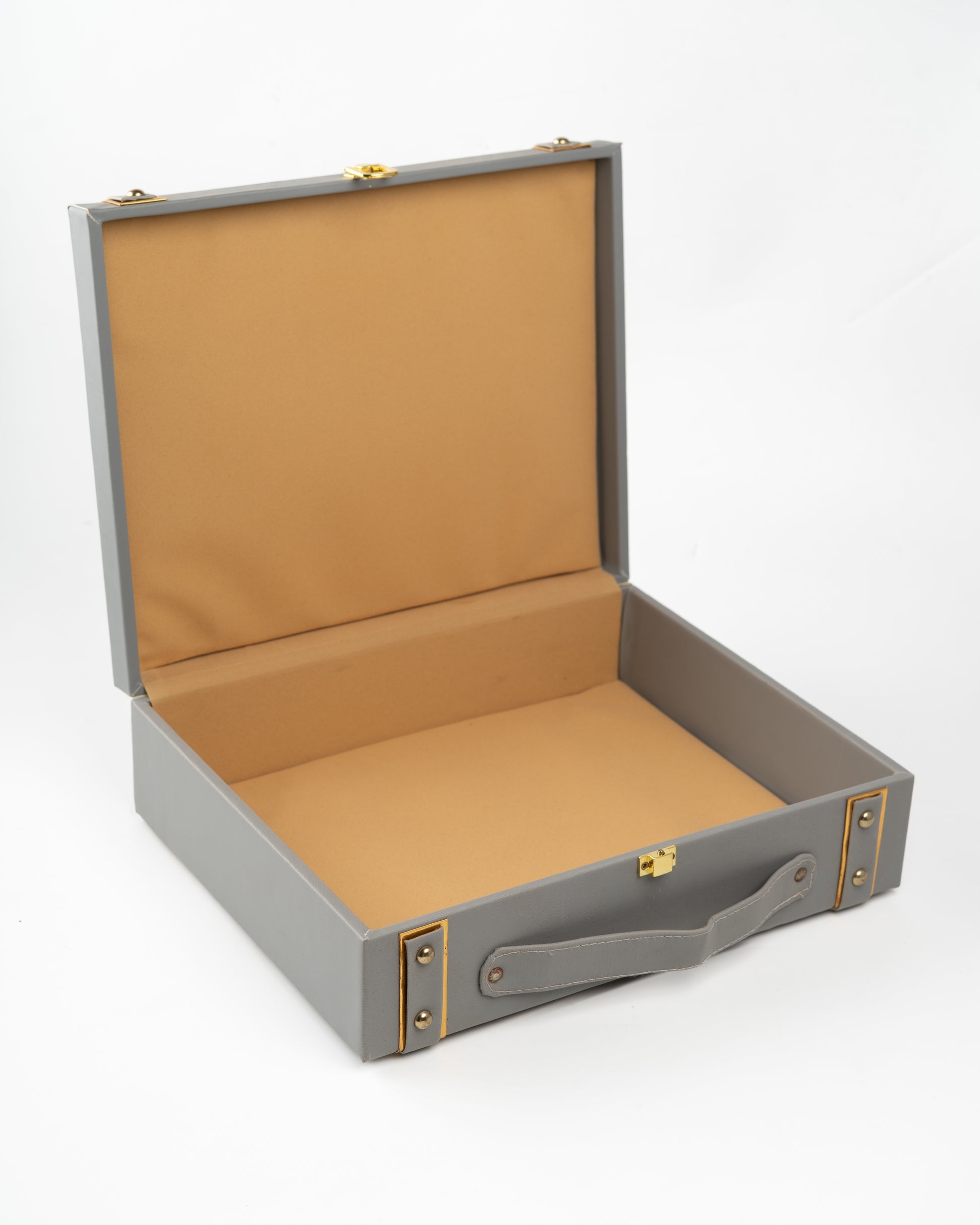 Add a touch of refined luxury to your packaging or gifting experience with this Grey Faux Leather Suitcase Paper Box with Gold Detailing. Designed in a classic suitcase style, this versatile box is perfect for storing gifts, keepsakes, or corporate giveaways. Its smooth grey faux leather exterior is accented with gold metallic detailing and rivets, while the tan interior lining adds a warm and classy contrast.