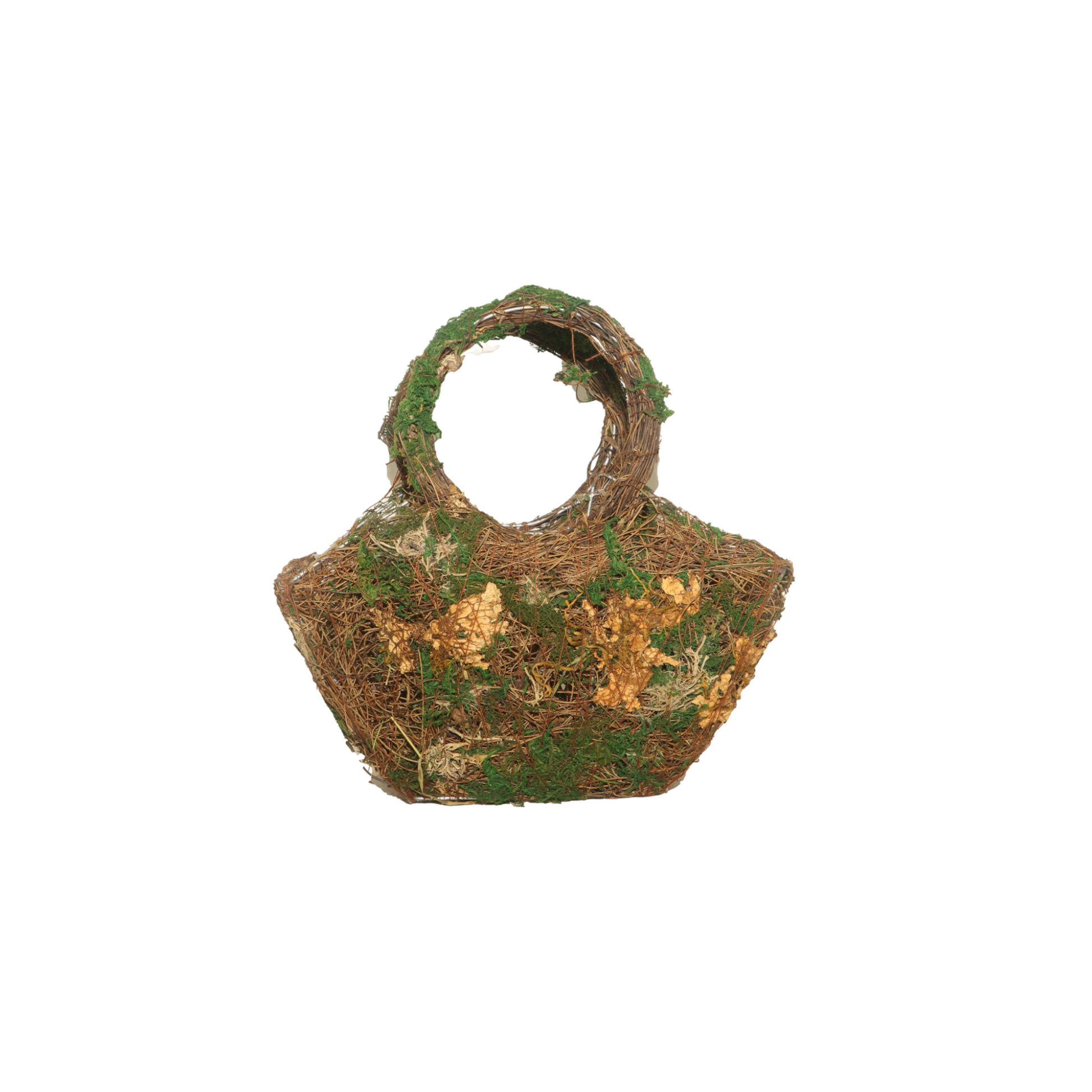 Add a touch of natural elegance to your home décor with this beautifully handcrafted decorative basket. Designed with an earthy, woodland charm, this basket is made from natural twigs, moss, and dried accents, creating a rustic yet refined look. Its sturdy circular handle makes it easy to display or move, while the spacious interior is perfect for creative arrangements, seasonal displays, or as a stylish decorative piece. Whether used as a centerpiece, a unique storage solution, or part of event décor, this basket brings the beauty of nature indoors.