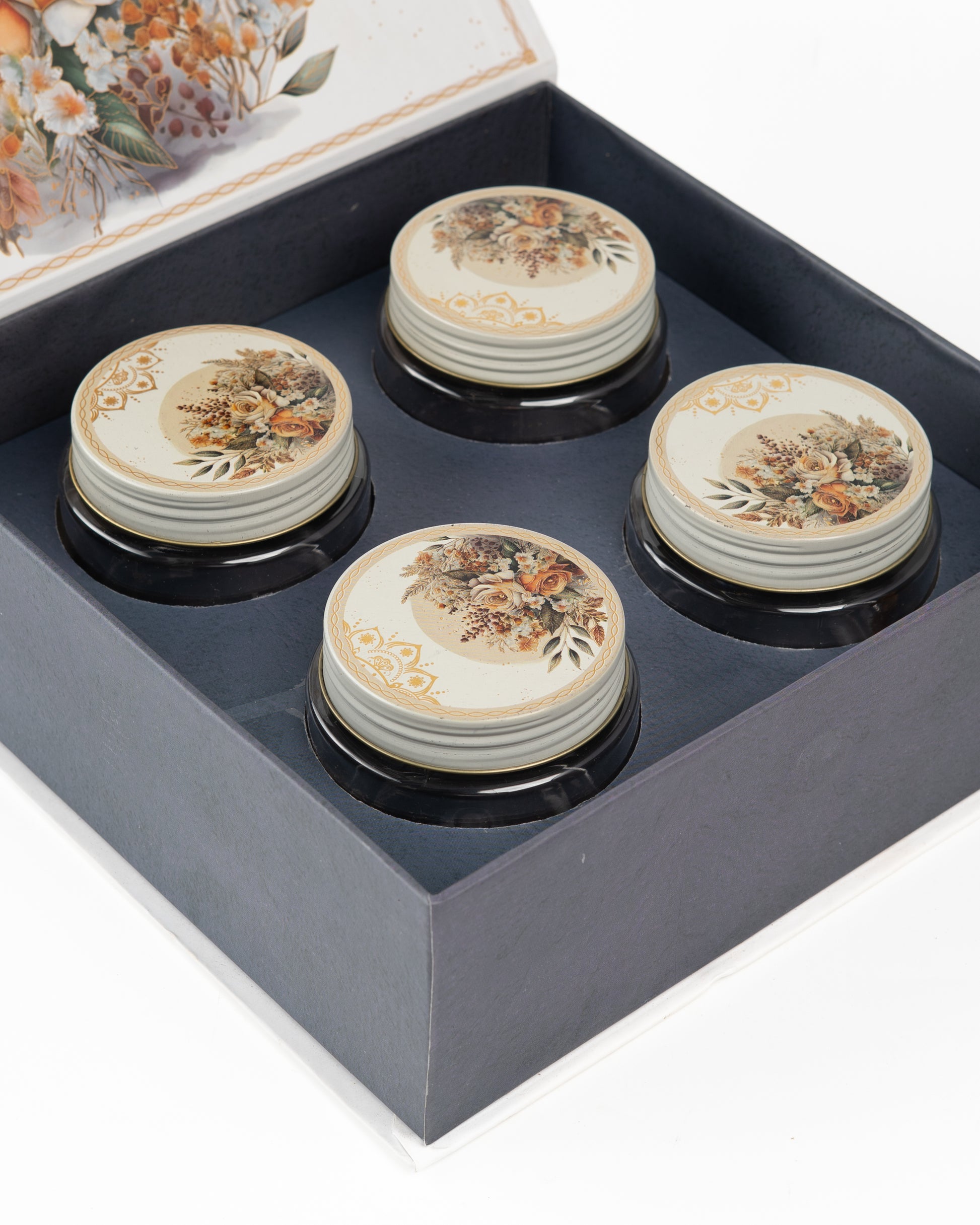 Elevate your gifting experience or home organization with this Blossom Rose Hamper Box With 4 Jars, beautifully housed in a sophisticated designer box. This set includes four transparent jars with intricately designed floral lids, combining practicality with artistic charm. Perfect for storing dry fruits, spices, herbs, or snacks, it also makes a thoughtful and aesthetically pleasing gift for festive occasions or special events.