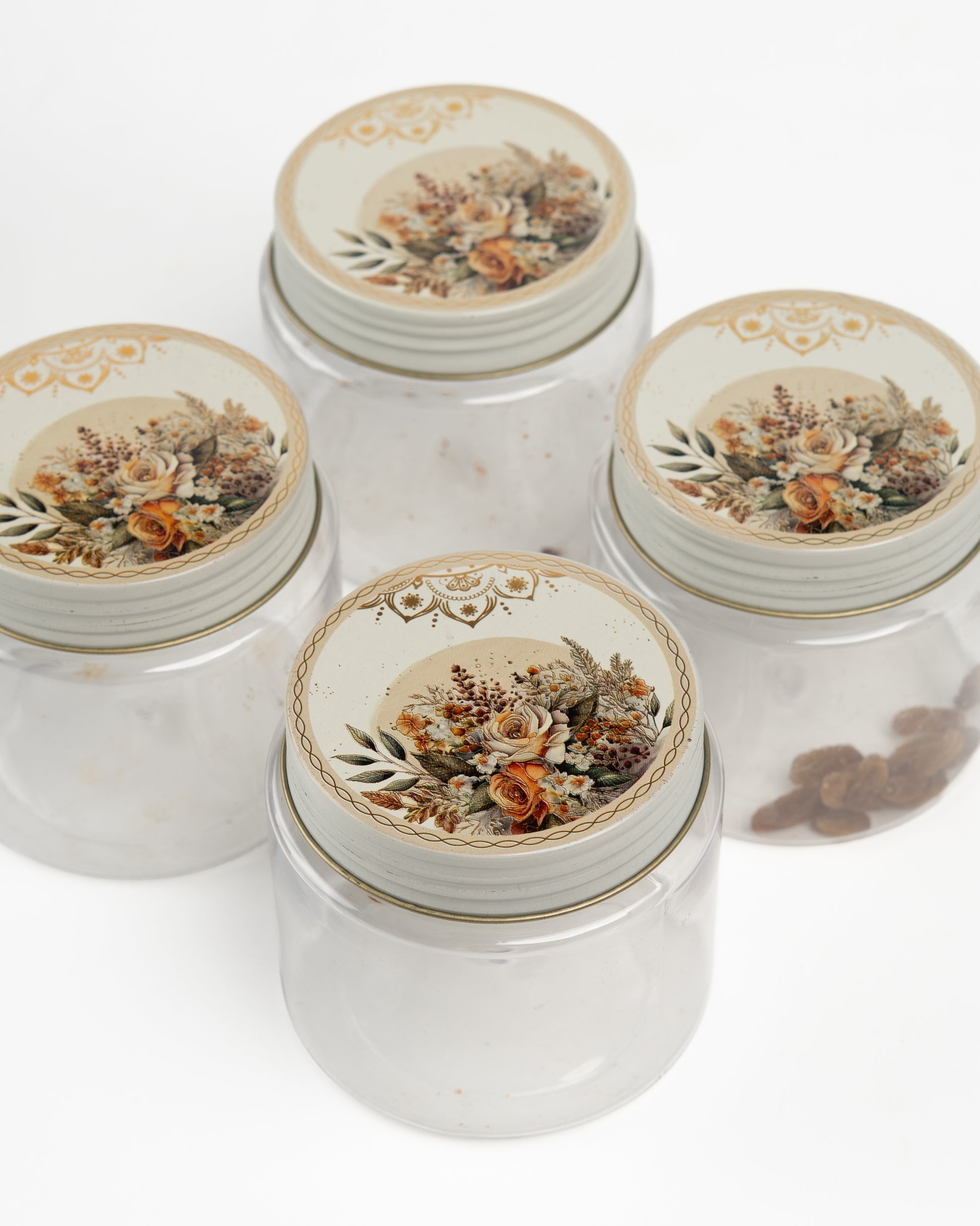 Includes four clear plastic jars with matching floral-printed lids. Each jar is lightweight yet durable, designed for everyday use while enhancing your kitchen or pantry decor. -