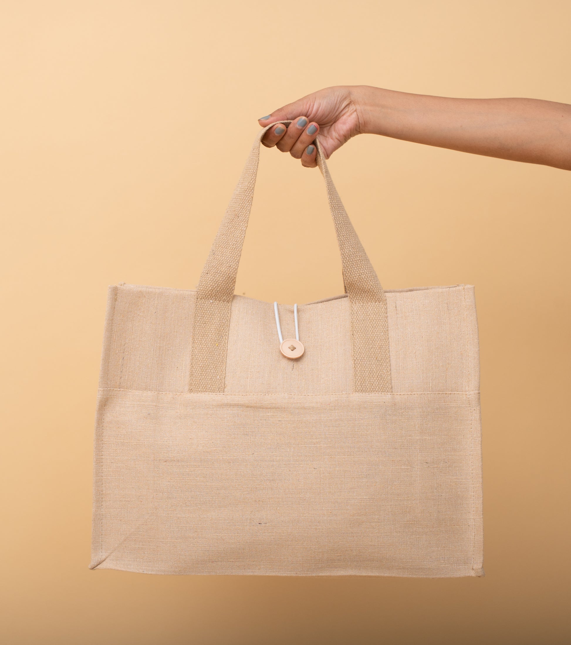 The natural weave and soft beige tone offer a rustic aesthetic, while the broad cotton webbed handles ensure comfort even when carrying heavier loads. Featuring a secure wooden button loop closure, this bag adds a charming detail to its earth-friendly appeal.