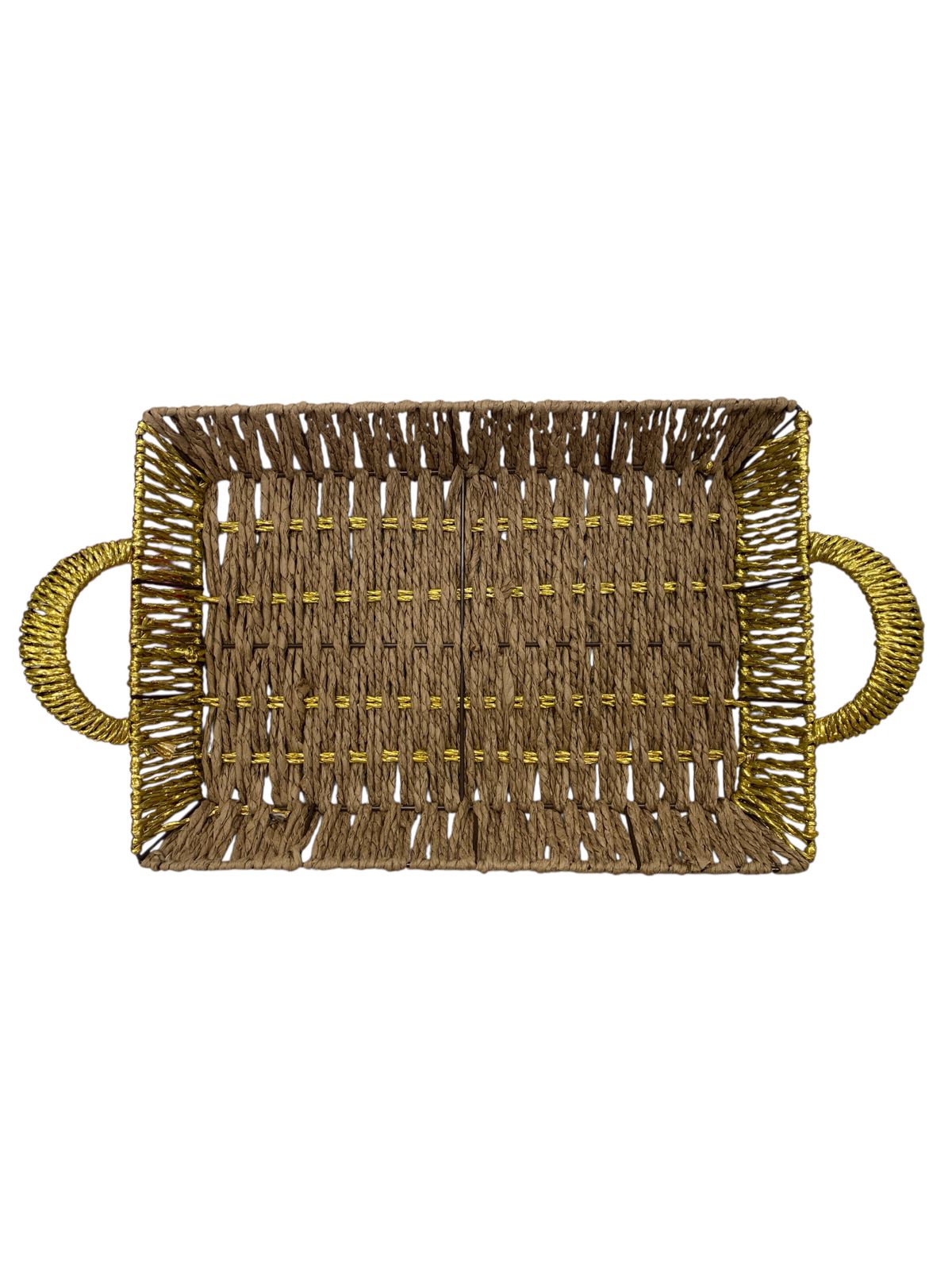Plastic Woven Wicker Tray Basket with Golden Accents – Handcrafted Decorative Serving & Storage Tray