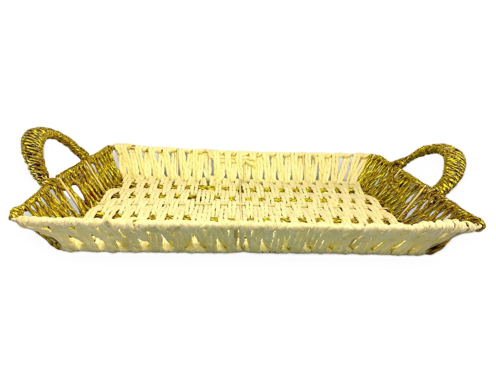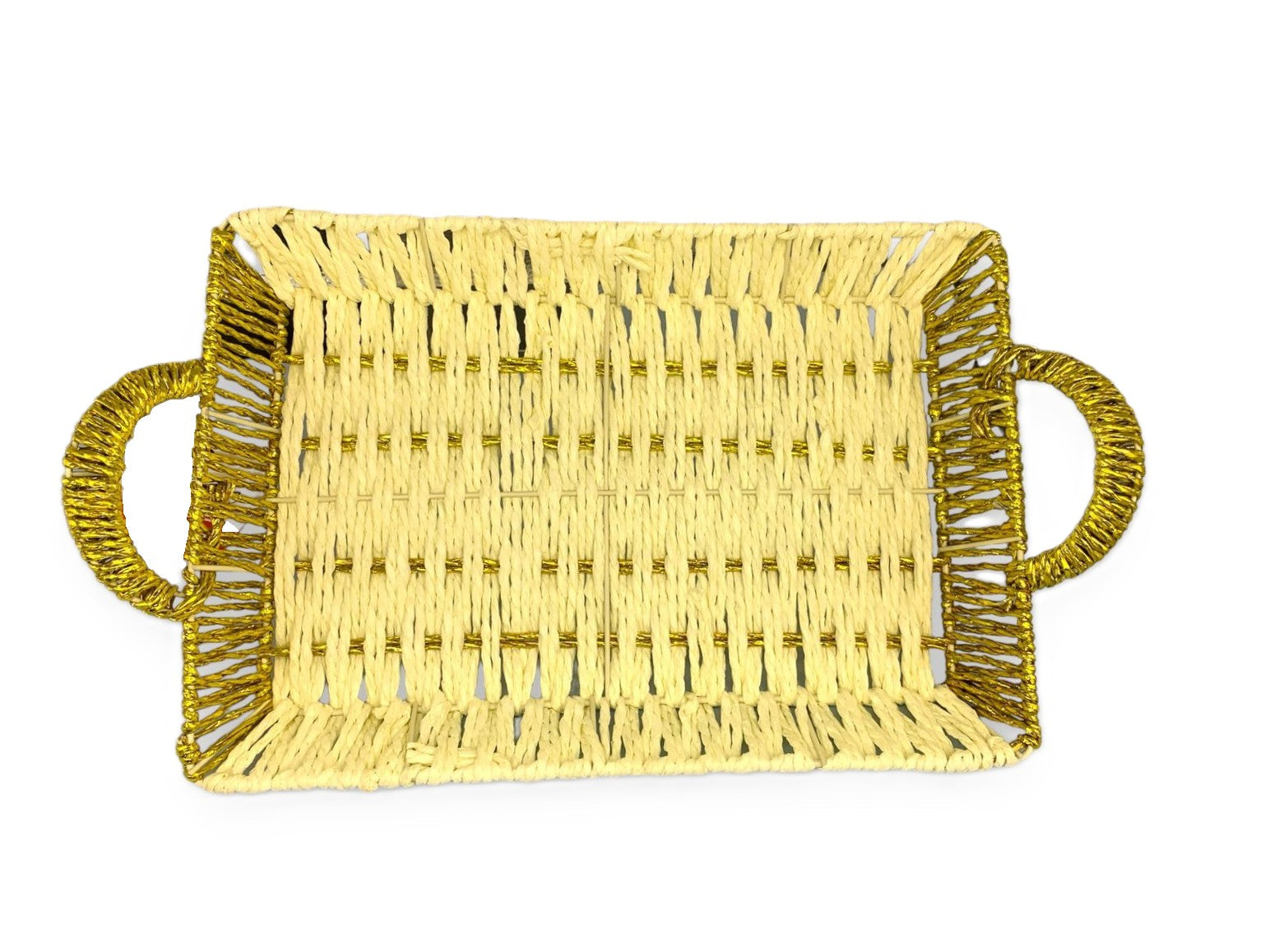 Add a touch of elegance and tradition to your home with this beautifully crafted Plastic Woven Wicker Tray Basket, enhanced with shimmering golden detailing. Designed using natural-inspired fibers and metallic threads, this tray exudes artisan charm while offering everyday practicality.