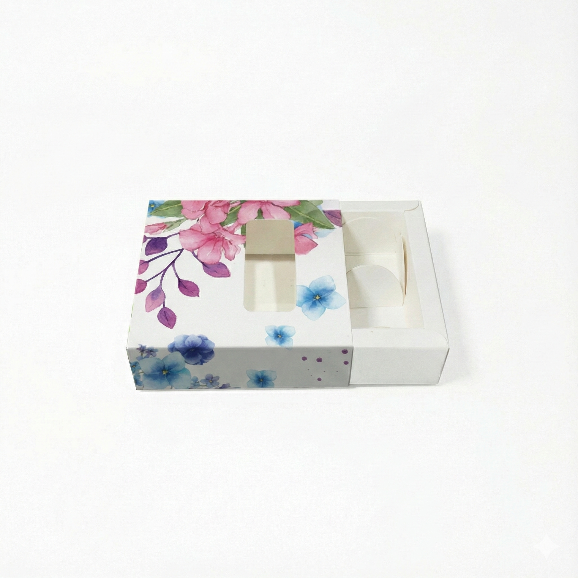 The slide-out inner tray comes with a curved insert that helps secure small items such as soaps, candles, jewelry, chocolates, mini cosmetics, and handcrafted items. The eye-catching floral artwork enhances the overall unboxing experience, making it ideal for festive gifting, weddings, birthdays, return favors, and premium product packaging.
