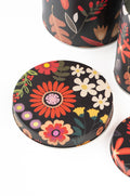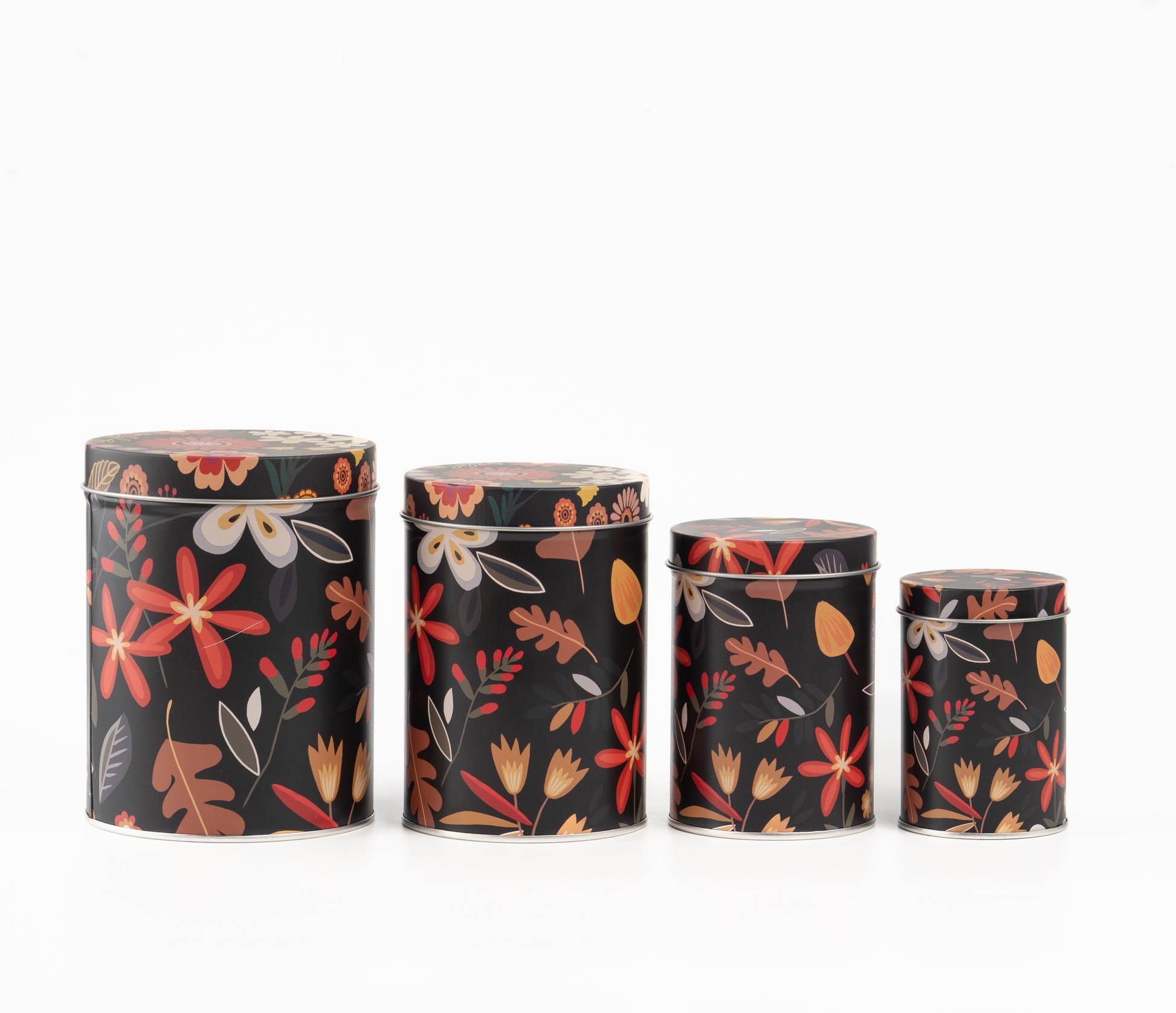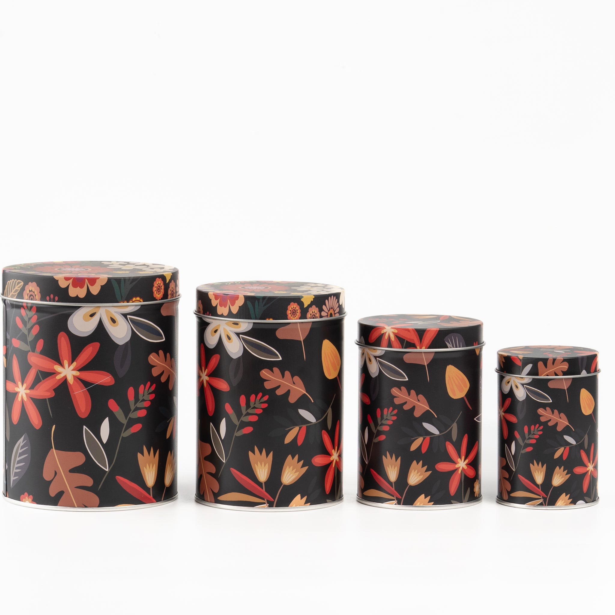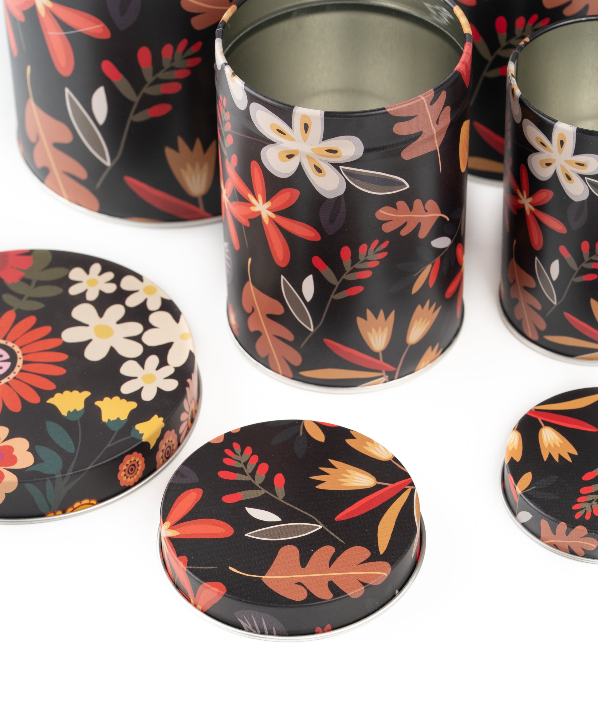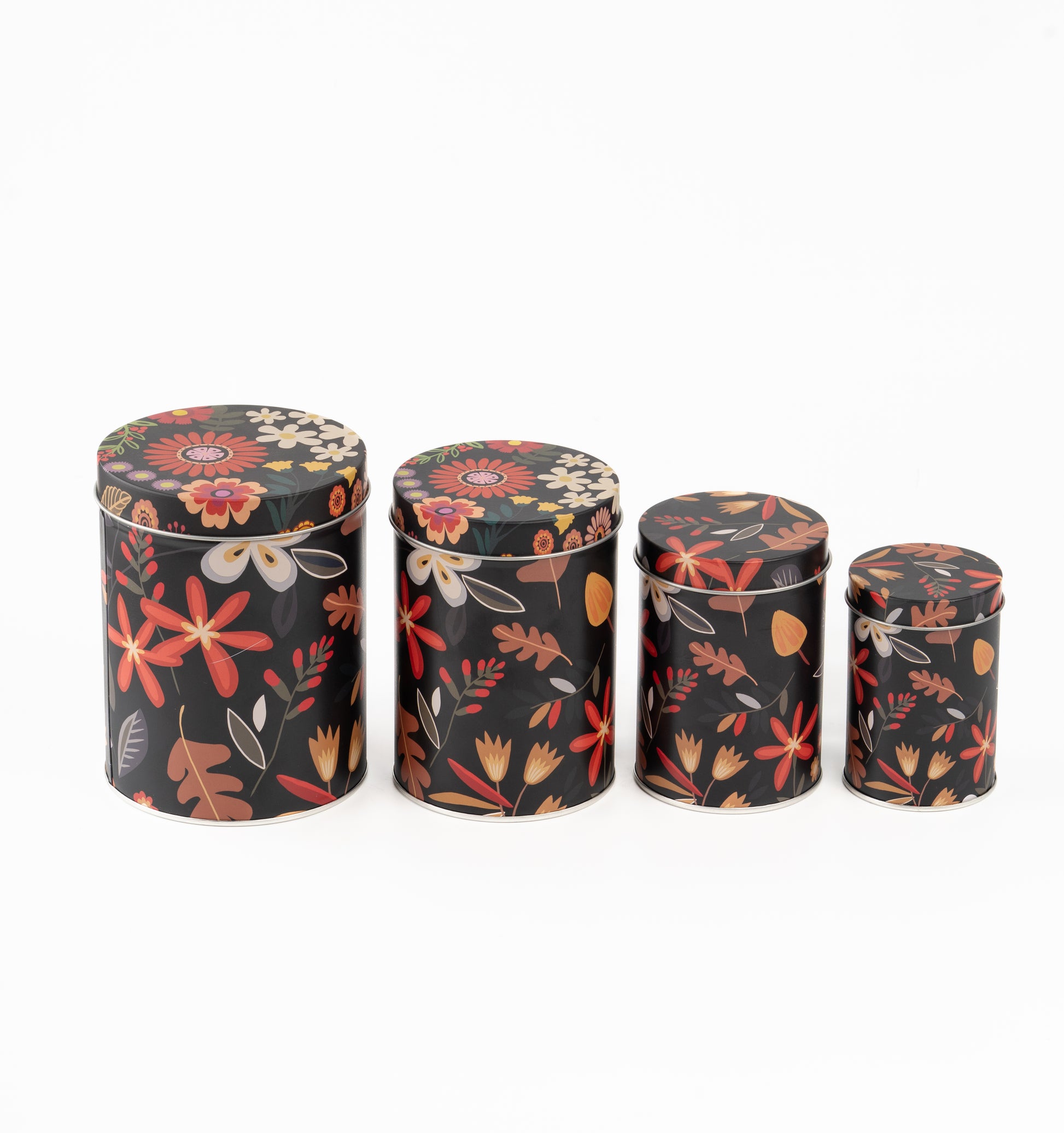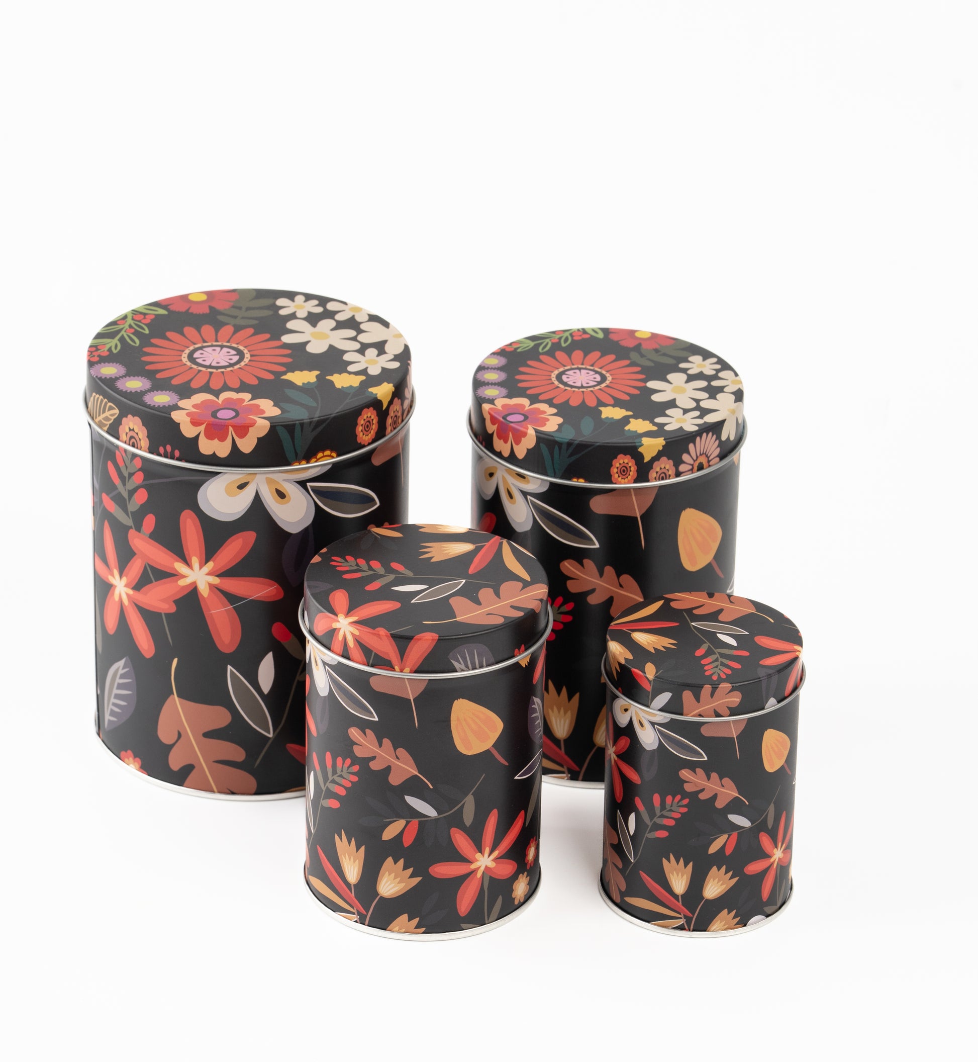Elevate your storage aesthetic with the Noir Floral Tin Metal Containers, a stunning fusion of dark elegance and botanical charm. Featuring a dramatic black background adorned with vibrant florals and autumnal foliage, this set of four cylindrical tins adds sophistication and warmth to any room.