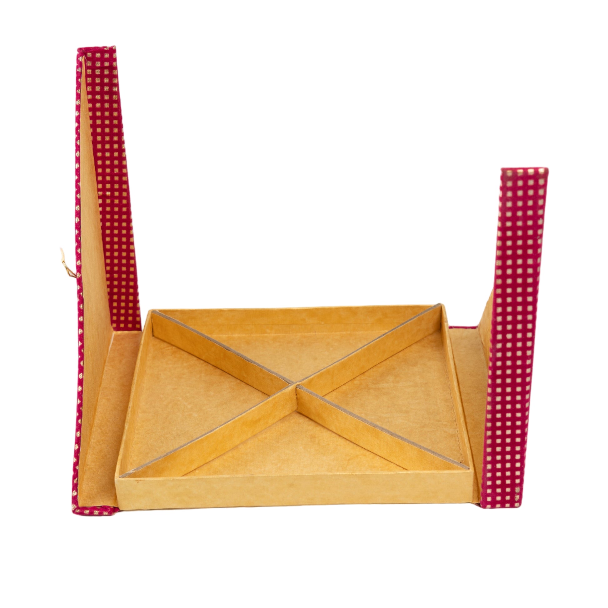 The box opens to reveal a well-structured interior featuring four equal compartments, ideal for organizing sweets, dry fruits, chocolates, small gifts, jewelry, or festive hampers. The sturdy build ensures durability, while the foldable side walls provide a clean, seamless finish when closed.