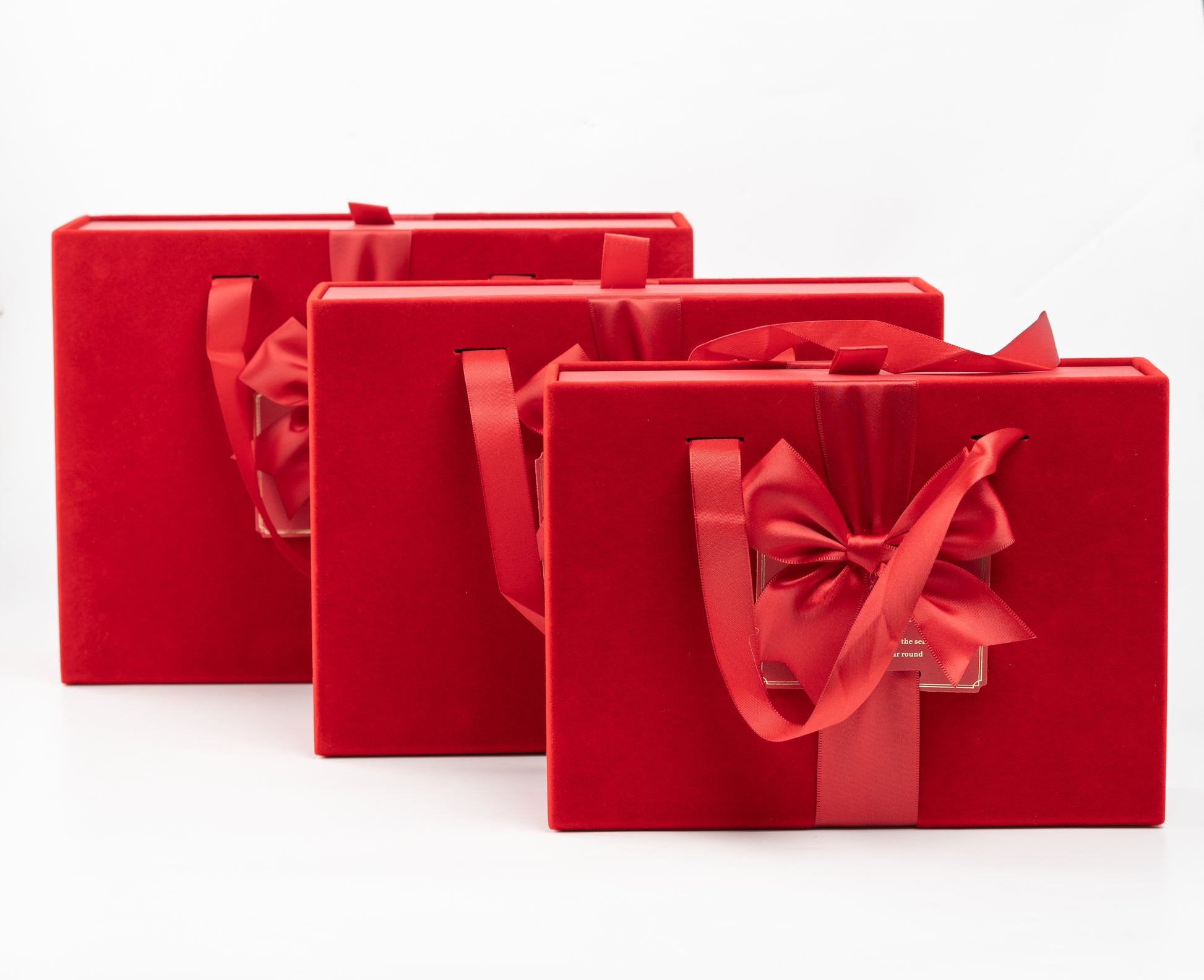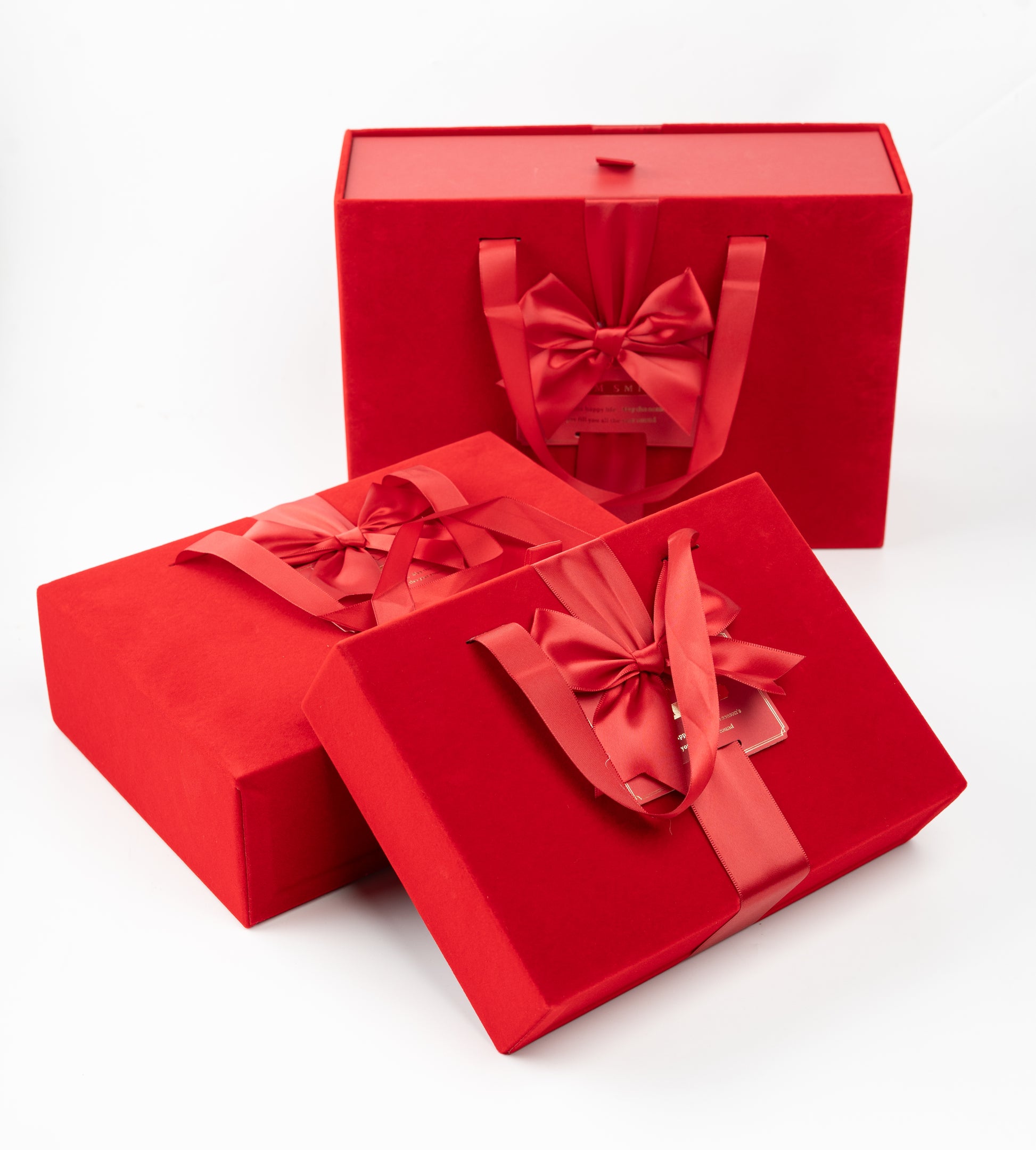 Make your gifts truly unforgettable with our Deluxe Velvet Paper Box Set with Satin Bow & Handle, featuring a luxurious soft-touch red velvet exterior, satin ribbon bows, and convenient carrying handles. Ideal for weddings, birthdays, anniversaries, corporate gifting, and festive celebrations, these boxes elevate the unboxing experience with their striking presentation and high-end feel. The set includes three different sizes to accommodate various gift types, from jewelry and cosmetics to gourmet treats and keepsakes.