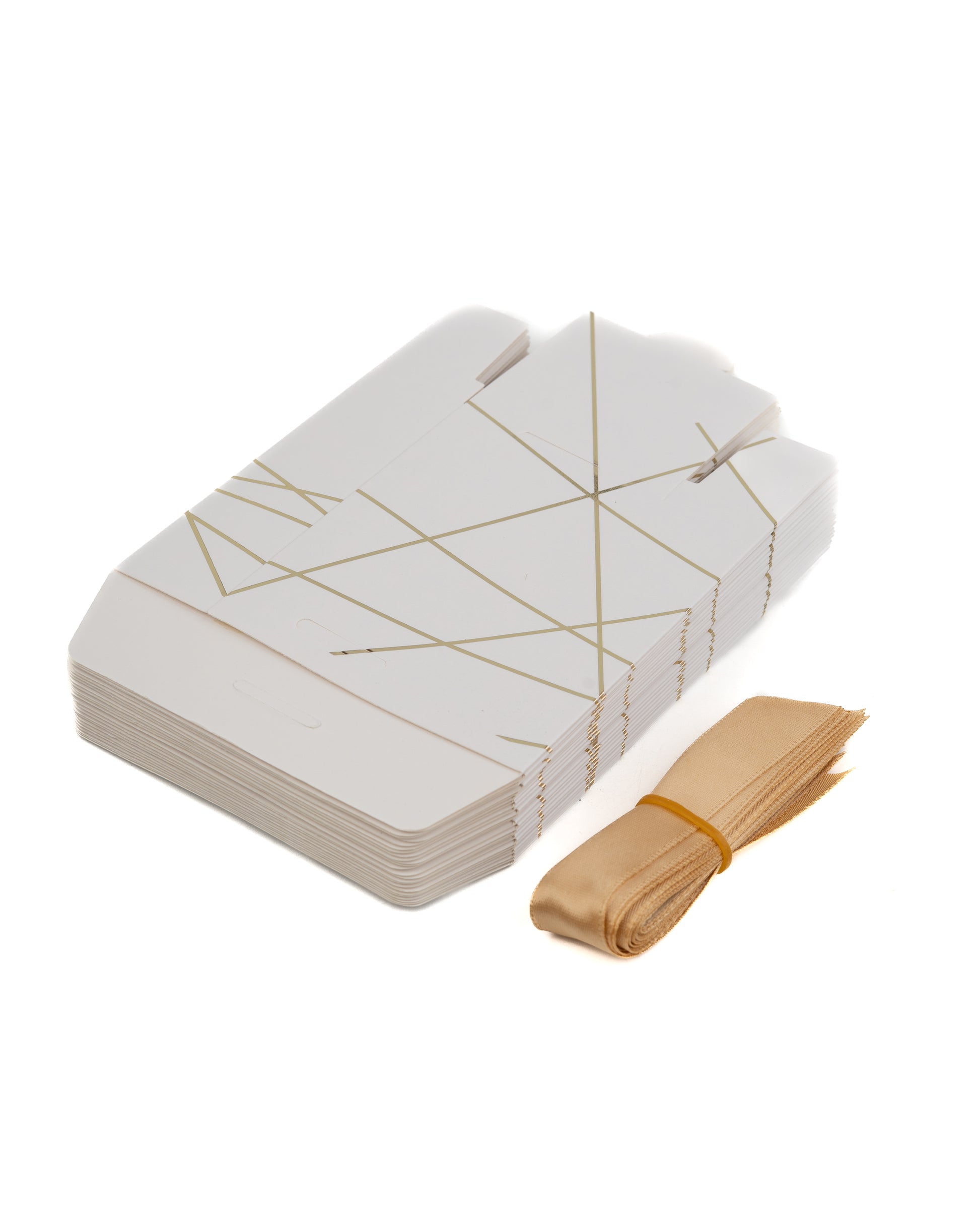 Sophistication meets contemporary elegance in our Gilded Glam Foldable Paper Box collection. Featuring sleek metallic gold stripes and a soft satin ribbon closure, these gift bags elevate any present with their chic design. Available in Pink, Blue, and White, these bags are perfect for weddings, birthdays, corporate events, or any occasion where a touch of luxury is needed.