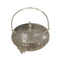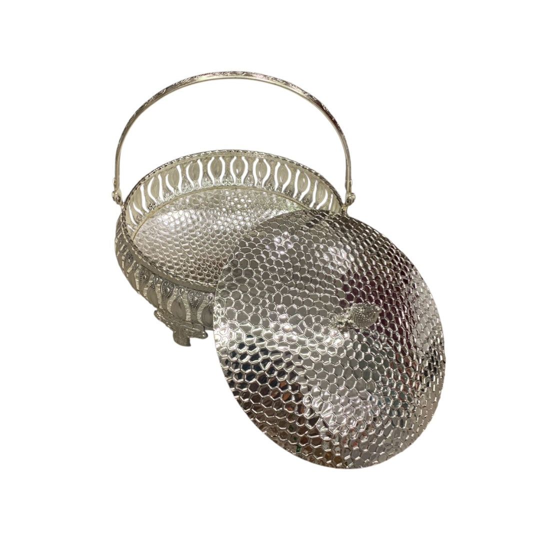 This beautifully designed silver-plated storage basket with a lid is a perfect combination of elegance and utility. Featuring a textured honeycomb pattern on the lid and intricate designs along the sides, it exudes a luxurious charm. Equipped with a sturdy handle, it is convenient to carry and ideal for serving or storing dry fruits, sweets, chocolates, or small accessories. A timeless piece for home décor and a thoughtful gift for festive occasions, weddings, or housewarmings.
