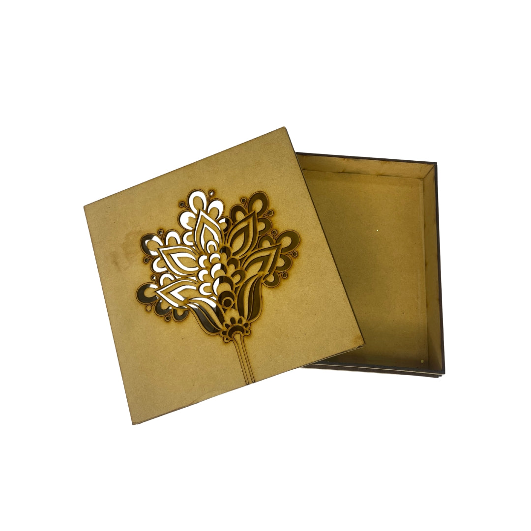This Laser Cut Floral Design Wooden Box features a beautifully layered, laser-cut floral design that gives the lid a striking 3D effect. Crafted from high-quality MDF, the box blends artistic detailing with everyday functionality. The intricately carved floral pattern adds a sophisticated and handcrafted look, making it perfect for gifting, jewelry storage, keepsakes, or home décor accents.