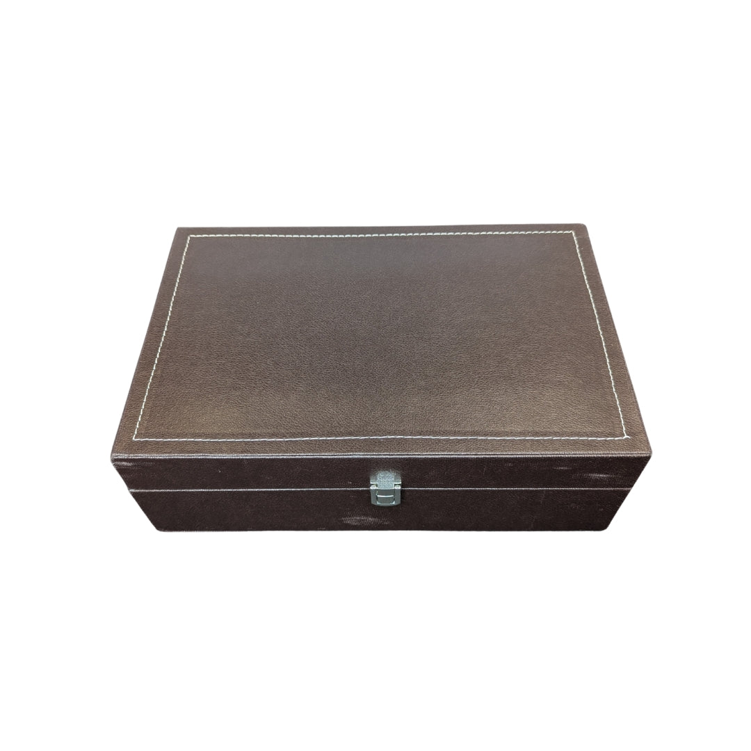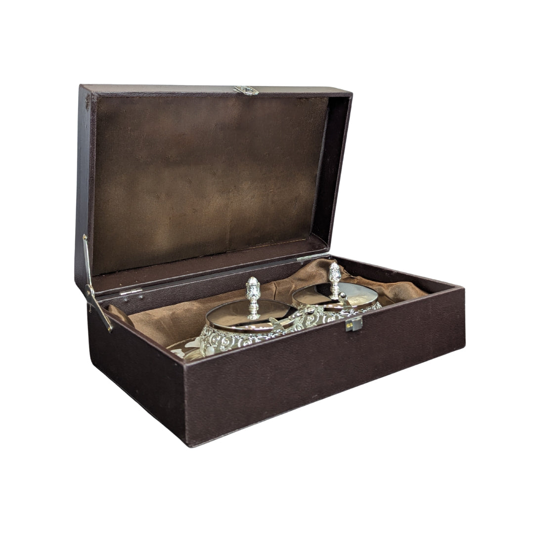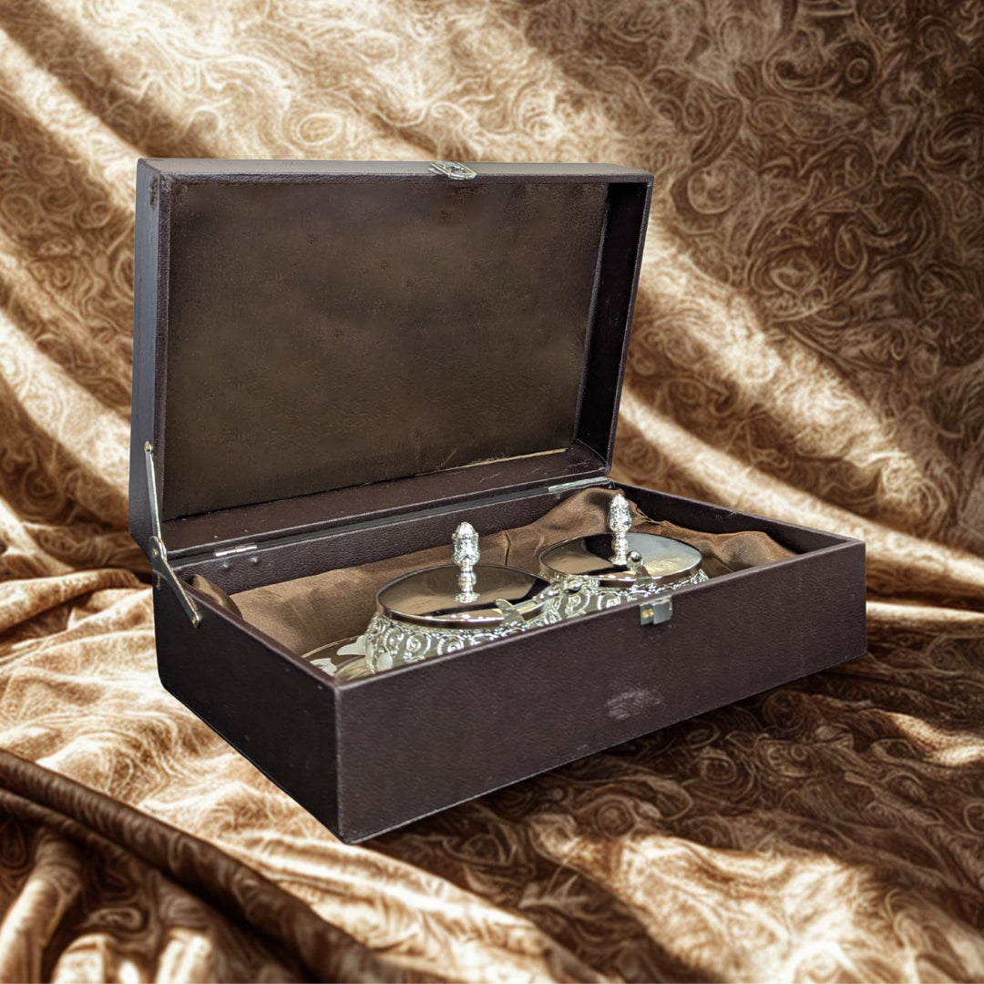 Bring elegance and tradition together with this luxury silver-plated twin bowl gift set. Featuring two beautifully handcrafted bowls with ornate silver lids and delicate detailing, this set is housed in a premium brown leather-textured gift case lined with rich fabric. Perfect for serving or gifting dry fruits, sweets, chocolates, or festive treats, it makes an ideal choice for weddings, anniversaries, corporate hampers, and festive celebrations. A timeless blend of luxury, craftsmanship, and utility.