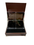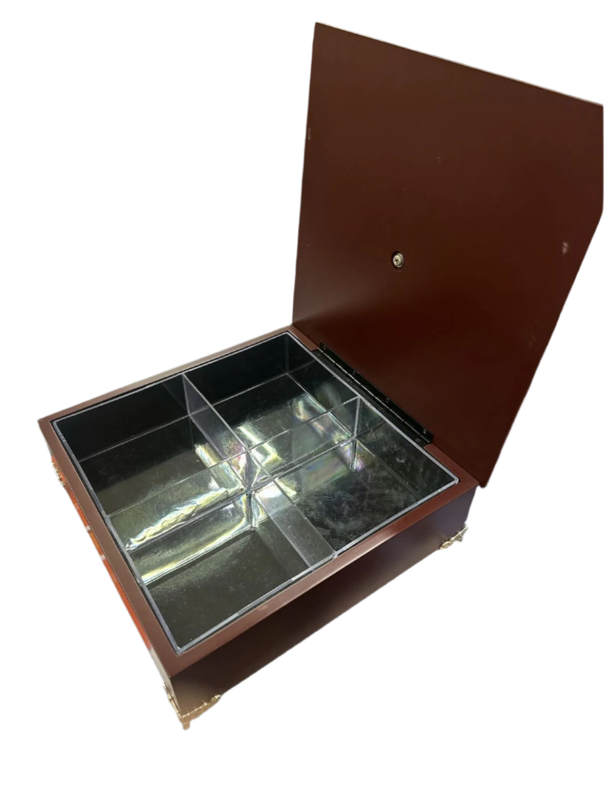 Classic Brown Wooden Box with Glass Partitions is the perfect blend of function and style. Crafted with attention to detail, the box features a beautiful rich brown wood finish, accented with silver detailing at the corners and elegant hardware. The box opens to reveal a compartmentalized interior, complete with four glass sections, perfect for organizing your jewelry, trinkets, or other small treasures.