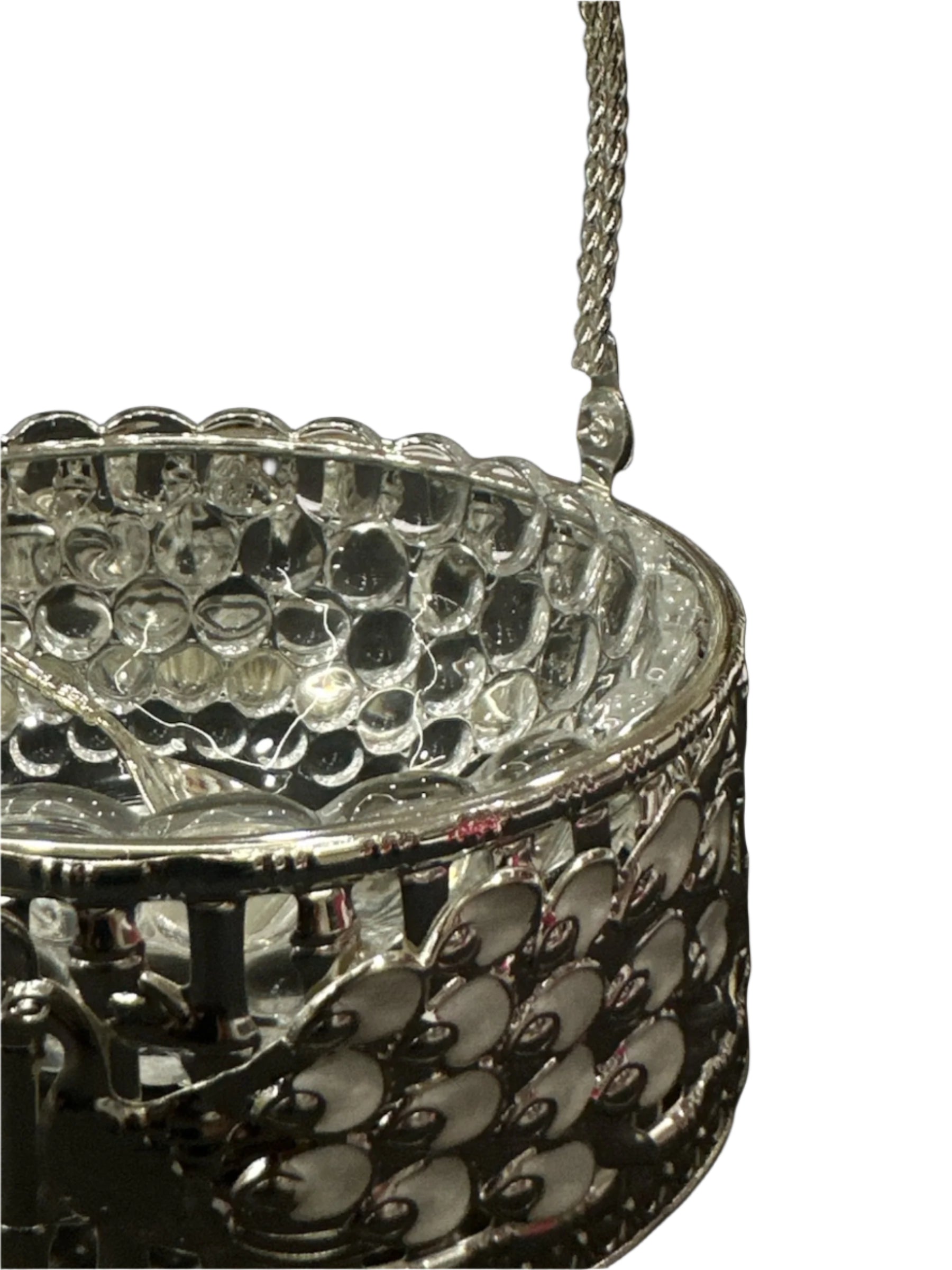 This Vintage Glory Glass Basket with Intricate Silver Detailing is a stunning piece designed to add a touch of sophistication to your home decor or special occasions. Perfect for weddings, anniversaries, or as a decorative centerpiece, this basket combines intricate silver detailing with a clear crystal base. The beautifully braided silver handle and delicate bamboo-style design make it an exquisite item for any occasion. Whether used for serving treats or as an ornamental display, this serving basket is sure to enhance the elegance of any setting.