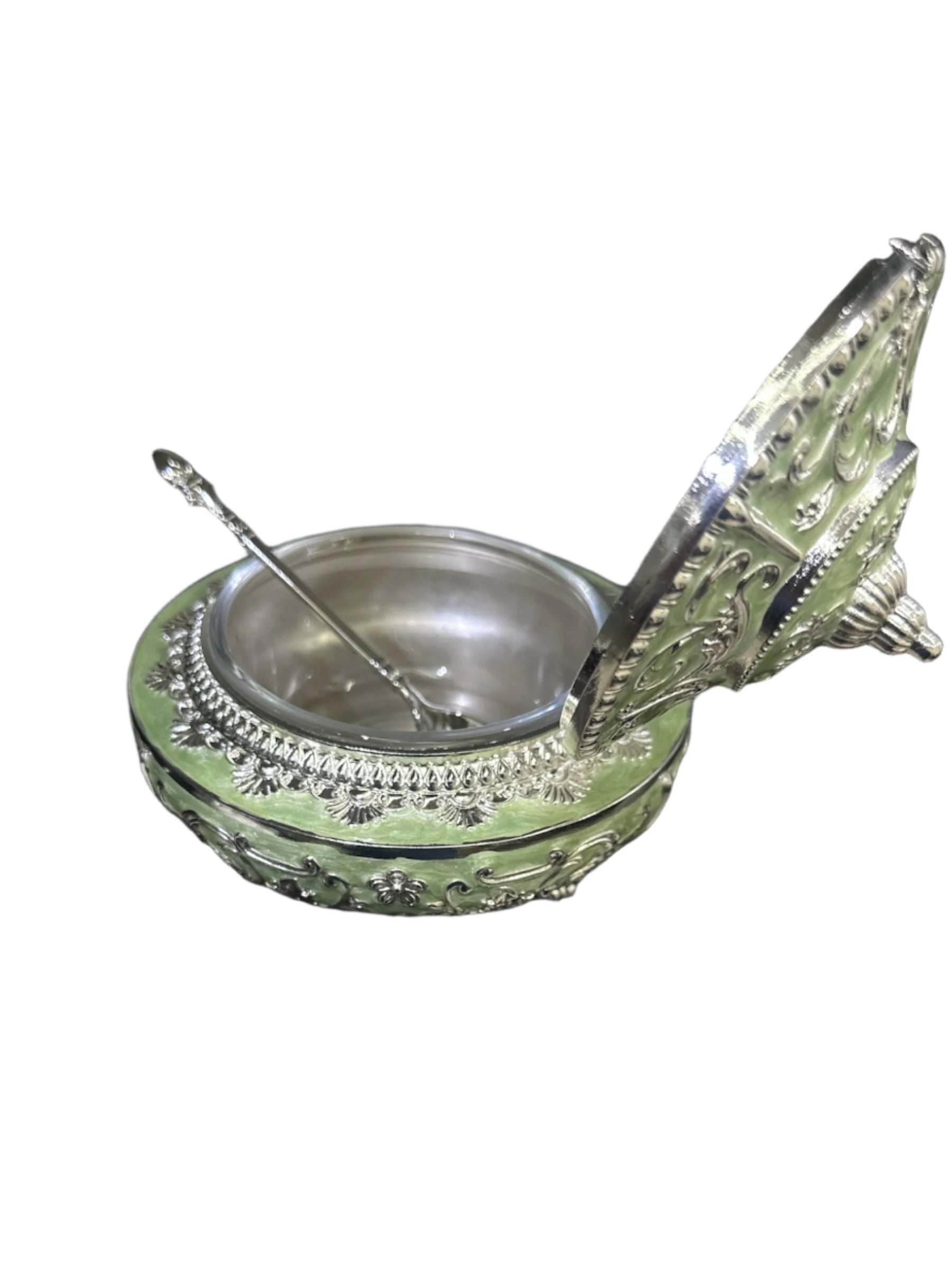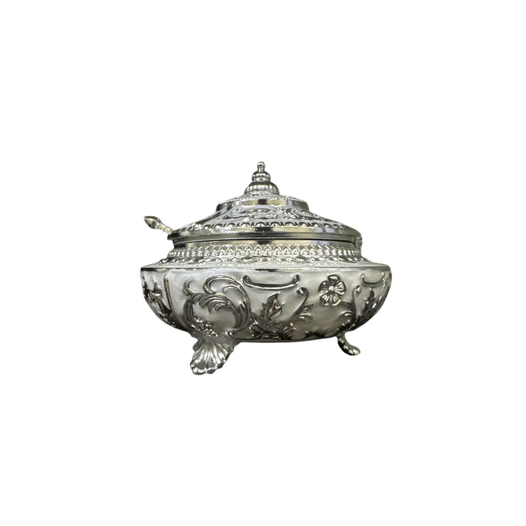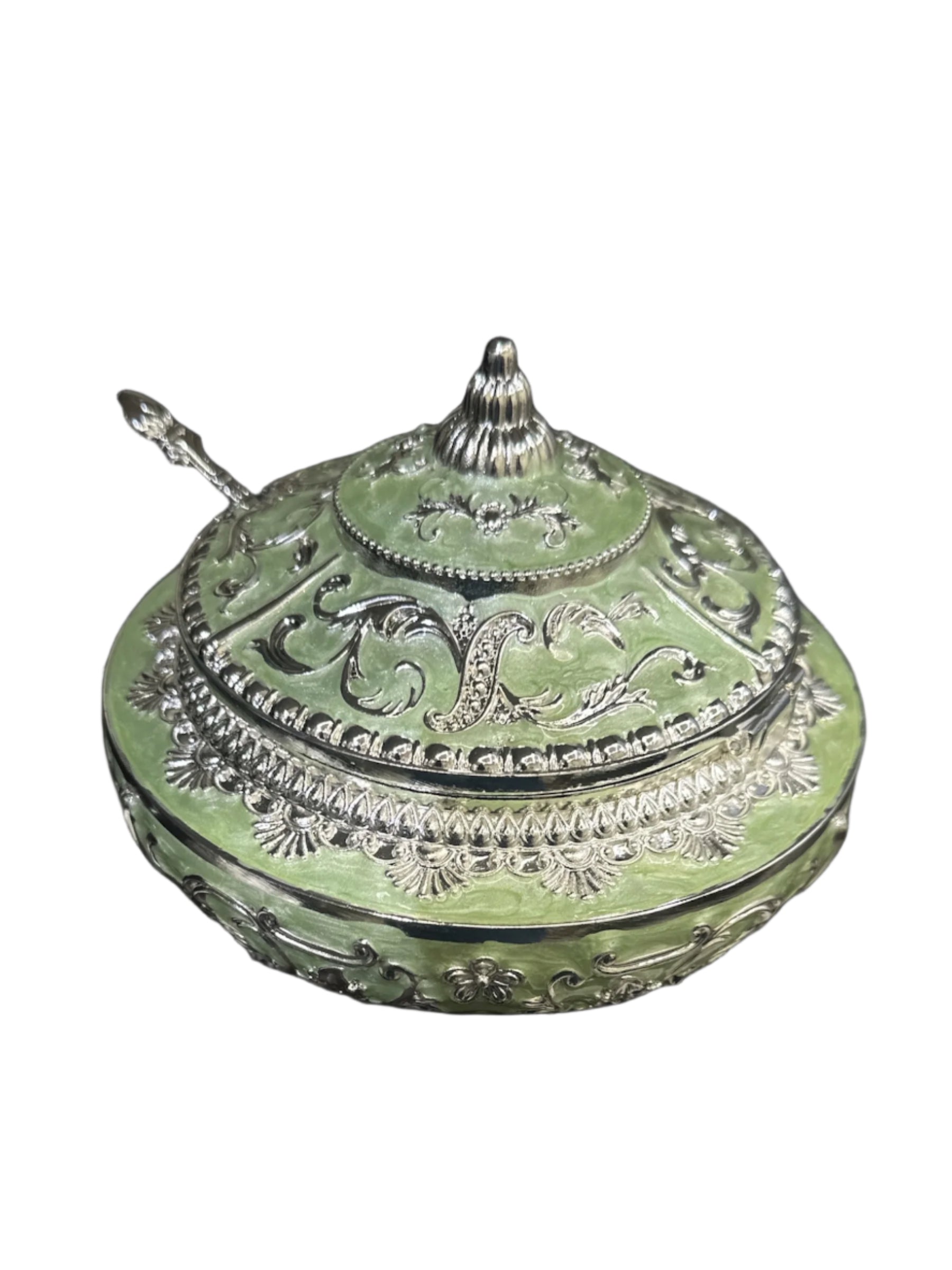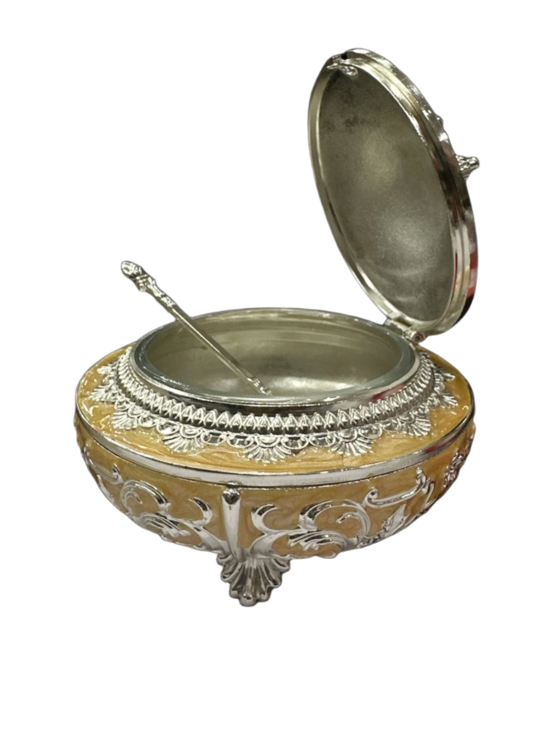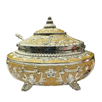 Each piece is complemented by a functional, ornate spoon and a secure, tightly-fitting lid, ensuring your treasured items remain safe while displayed in style. This box is also packaged in a deluxe brown gift box, making it the perfect gift for weddings, anniversaries, or housewarmings.