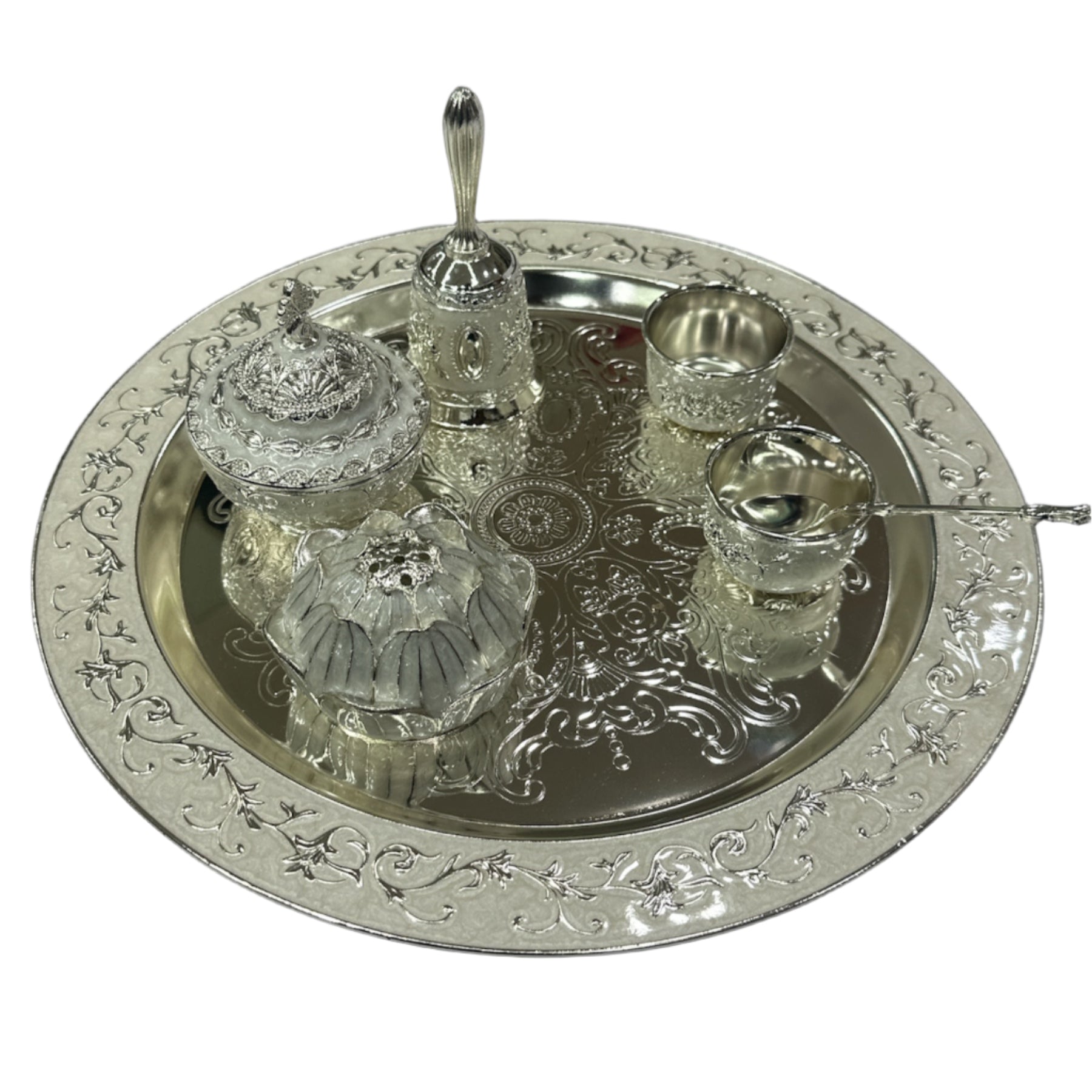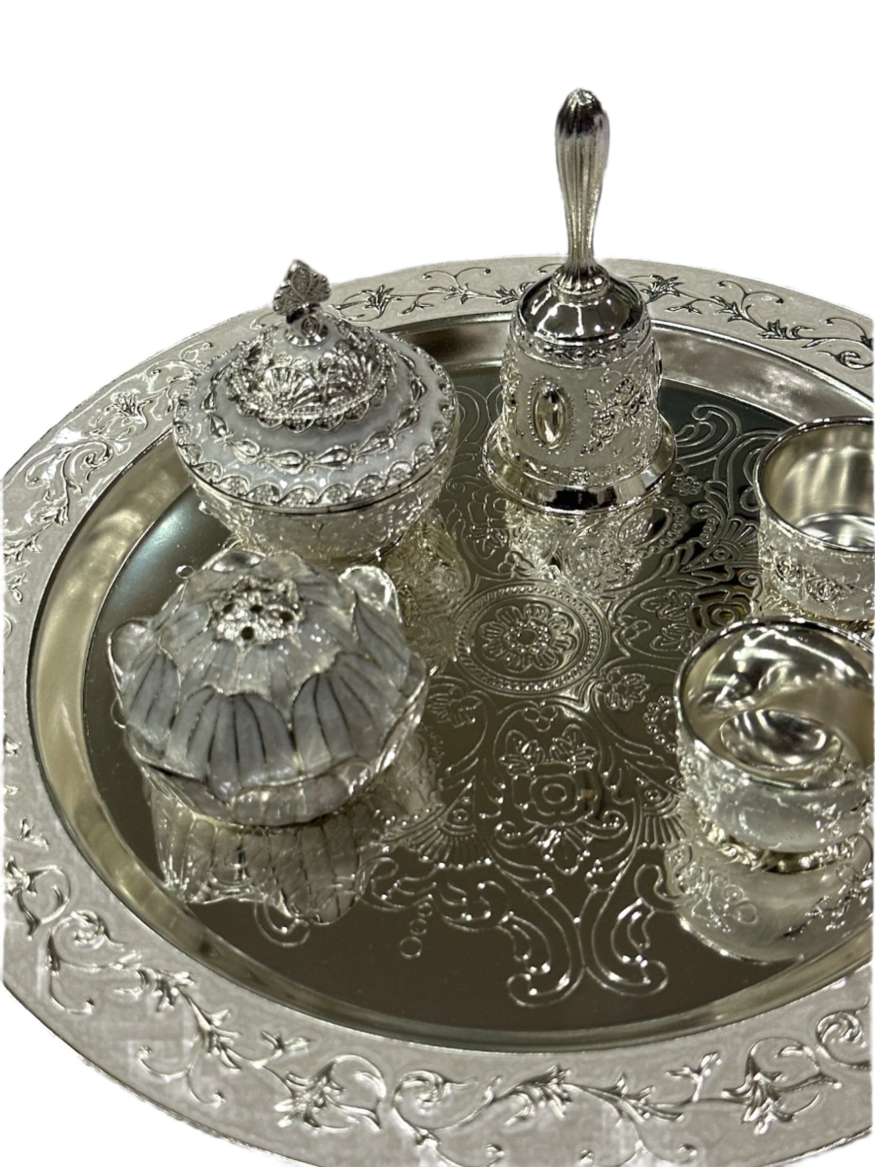Deluxe Silver Pooja Thali Set with Embellished Ritual Utensils