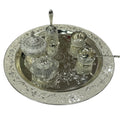 Presenting the Deluxe Silver Pooja Thali Set with Embellished Ritual Utensils, a perfect blend of elegance and tradition, designed to enhance your religious ceremonies. This meticulously crafted set features a beautifully engraved silver-plated thali with intricate floral patterns, complemented by essential ritual items including bowls, a bell, a spoon, and an ornamental lid. Each item is elegantly designed with detailed motifs that add a luxurious touch to your spiritual rituals. Ideal for Pujas, Aartis, and other sacred occasions, this set combines both functionality and aesthetic charm, making it an ideal addition to your altar or as a thoughtful gift for loved ones.