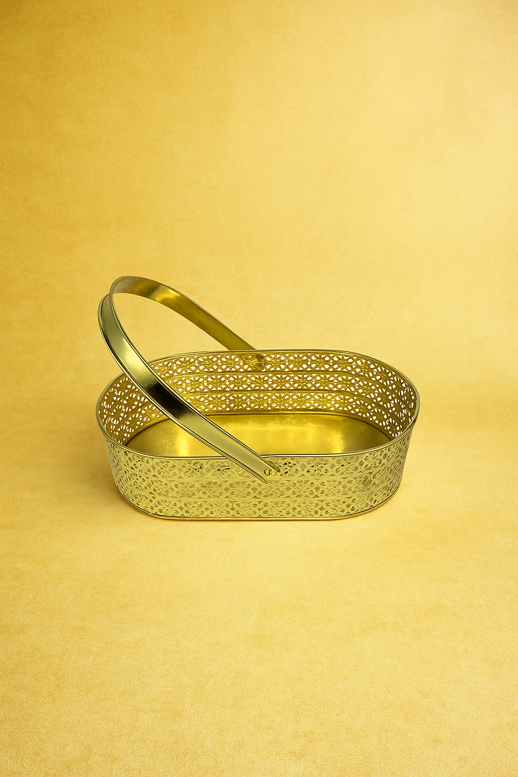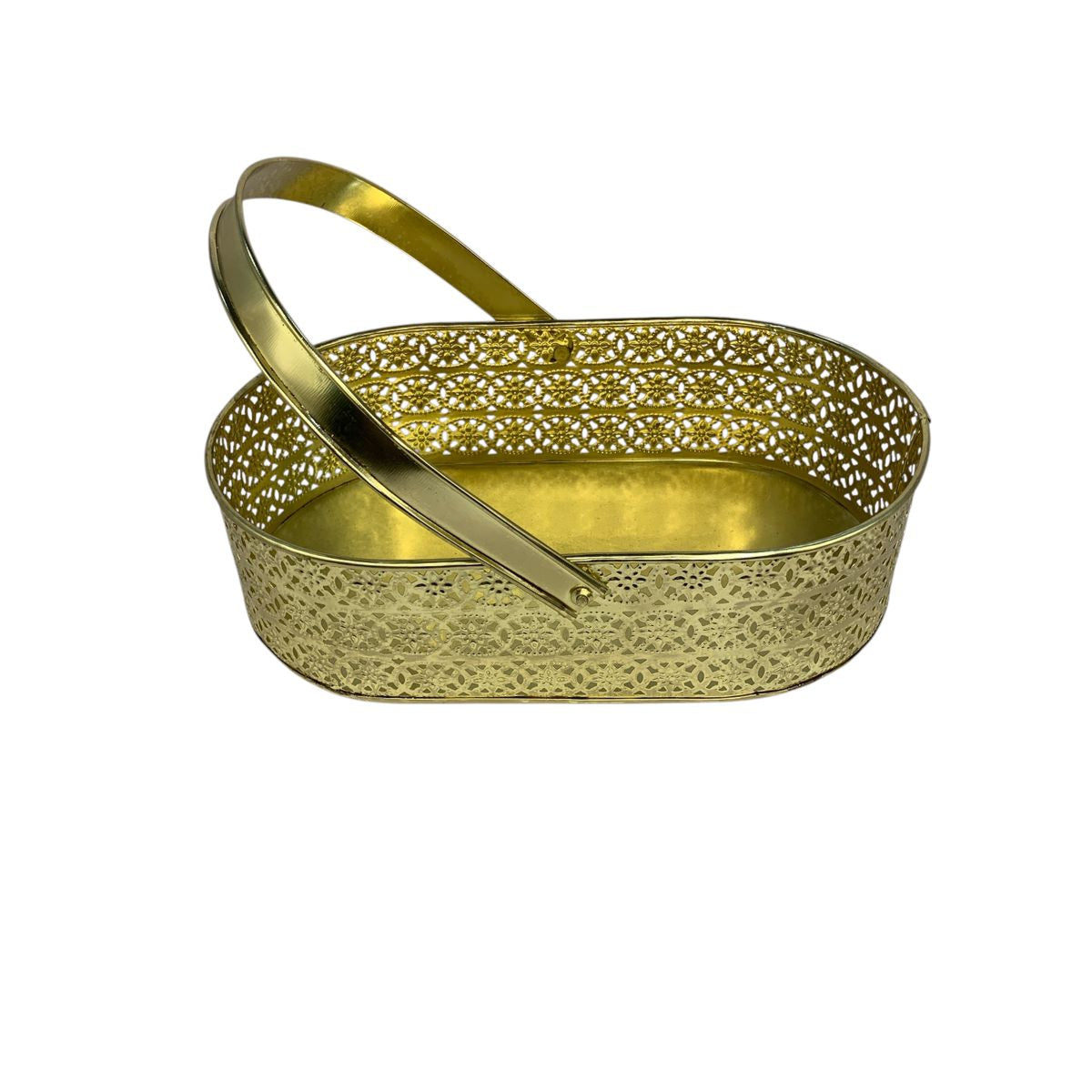 Golden Oval Metal Basket with Handle – Decorative Filigree Storage Basket