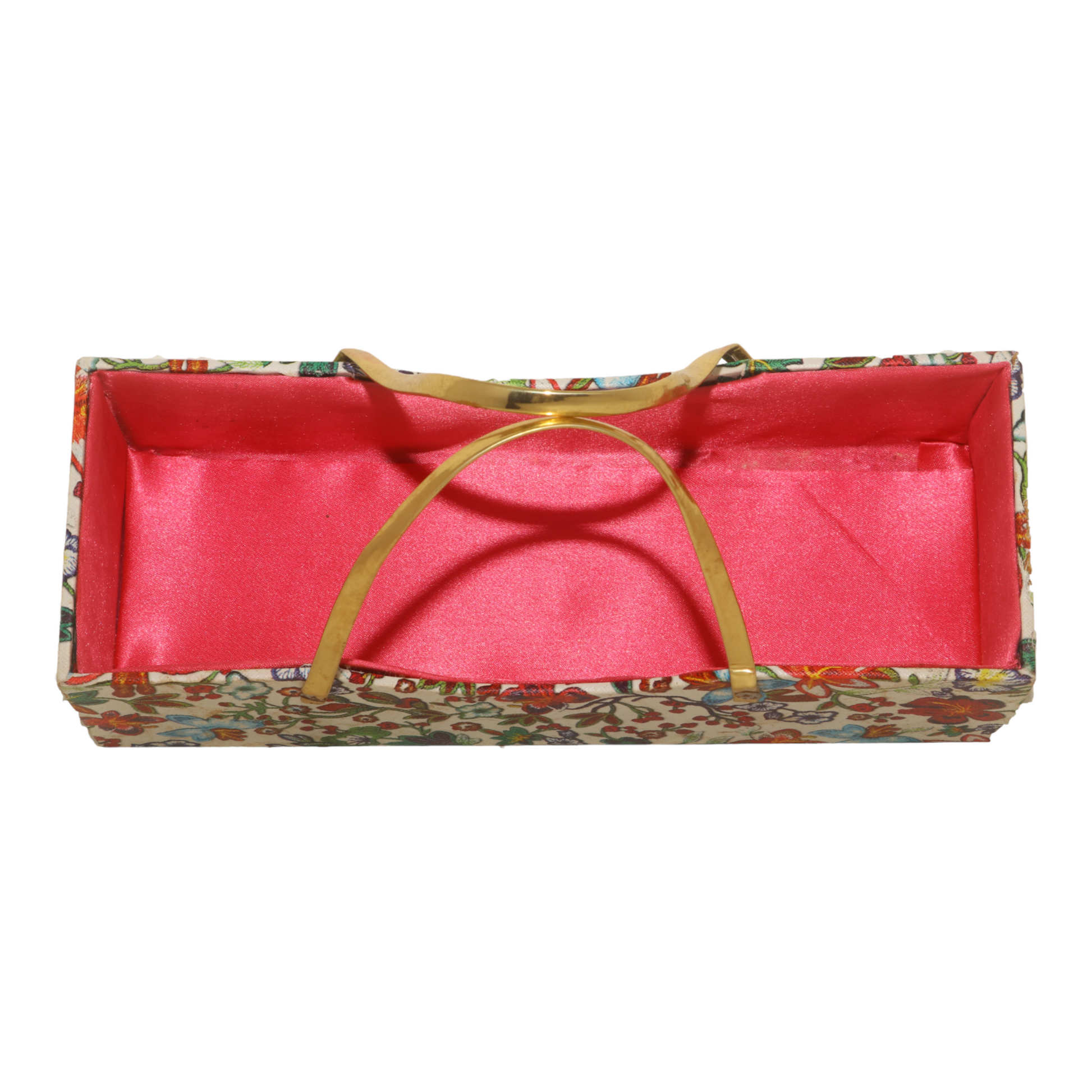 Add a touch of elegance and vibrant charm to your home with this beautifully handcrafted multipurpose storage caddy. Designed with a lively floral print and a luxurious red inner lining, this organizer blends functionality with aesthetics. The sturdy golden metallic handles offer easy portability, making it perfect for serving, organizing, or gifting. Ideal for homes that appreciate artistic décor with everyday usability, this caddy is both decorative and practical.