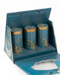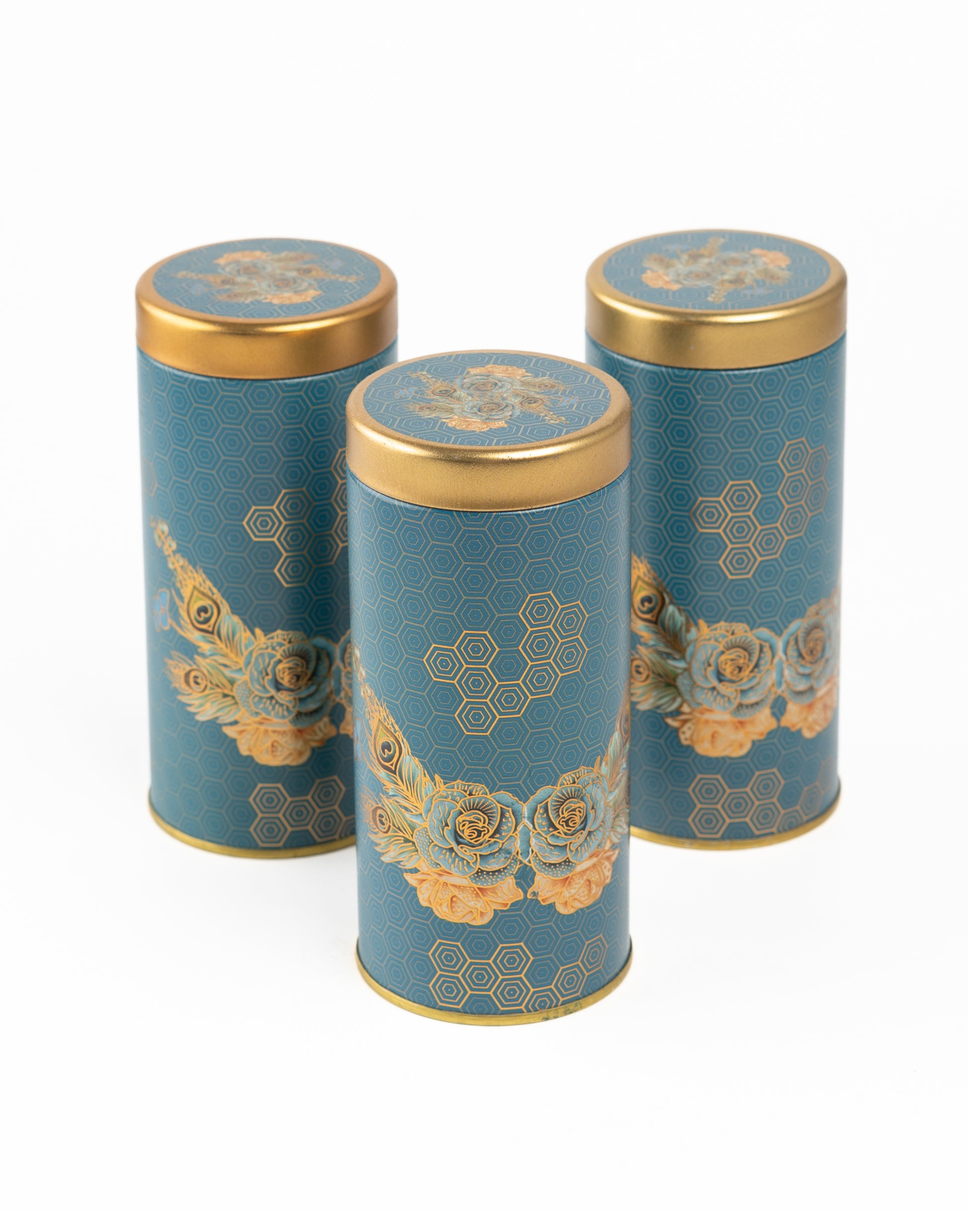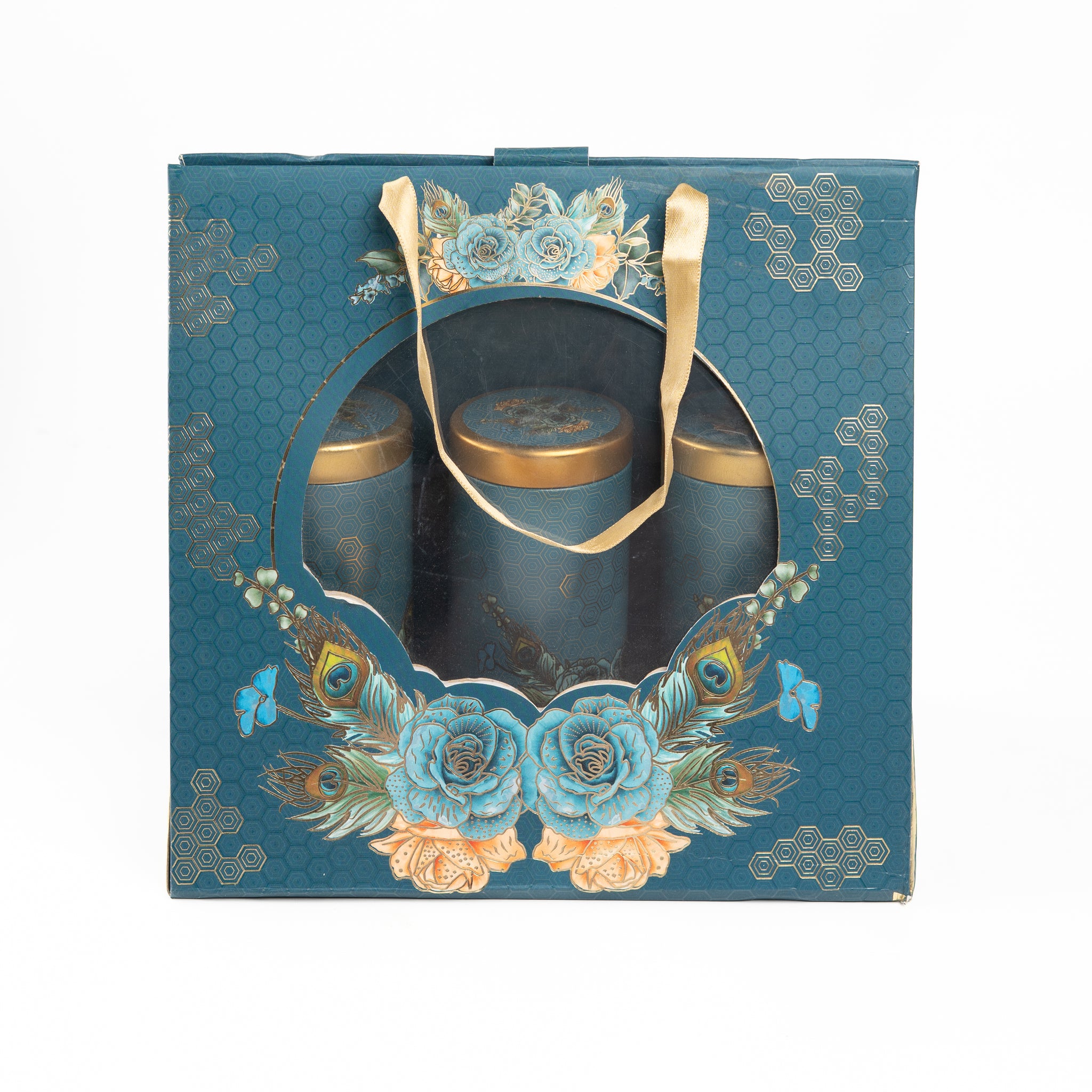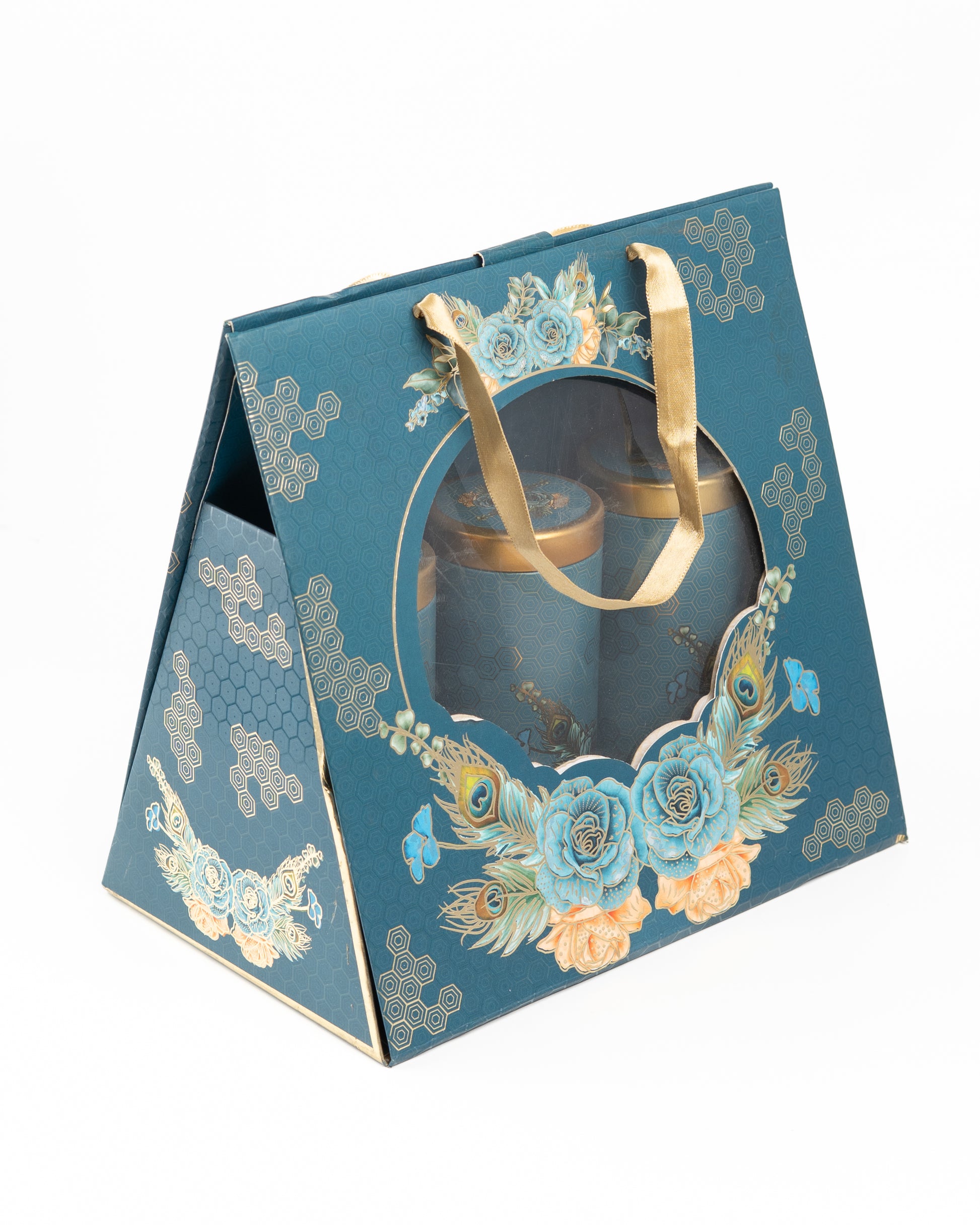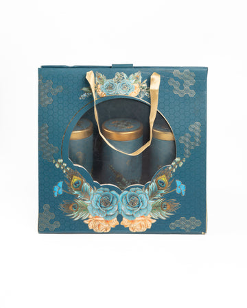 This luxurious ensemble makes a refined statement whether gifted during festivities, weddings, or as a memorable corporate offering. Each tin is finished in deep blue tones with accents of gold, adorned with roses, peacock feathers, and a subtle geometric backdrop—blending tradition with contemporary sophistication.