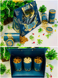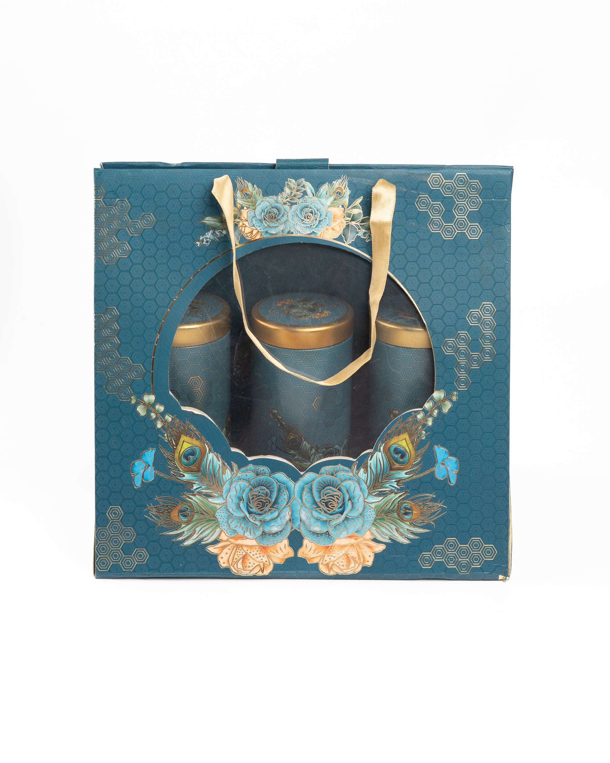 A tribute to regal elegance and botanical artistry, the Peacock Bloom Premium Three Tin Hamper Box is designed to elevate your gifting game. Enclosed in a rich teal hexagonal-patterned gift bag with a transparent window and floral-peacock detailing, this set contains three beautifully decorated cylindrical tins—perfect for tea, dry fruits, spices, or gourmet treats.