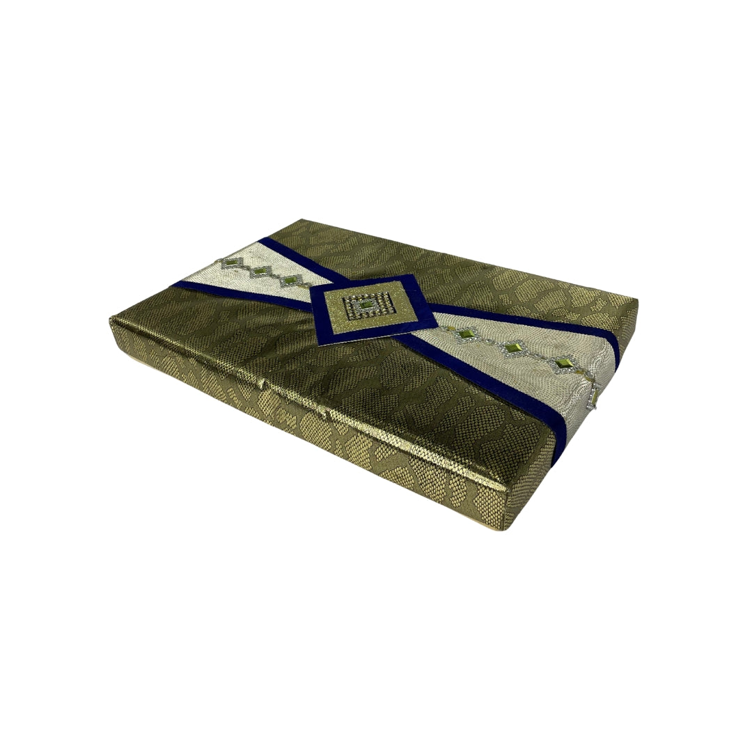 Elevate your gifting experience with this Gem Embellished Dry Fruit & Chocolate Gift Box, artistically crafted to bring an elegant and premium touch to your celebrations. The box features a rich golden textured exterior, beautifully complemented by deep blue velvet borders, intricate stone embellishments, and geometric design accents, giving it a royal and festive appeal.