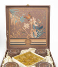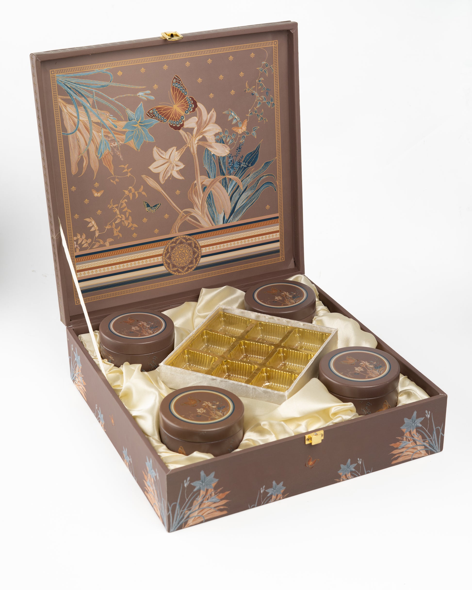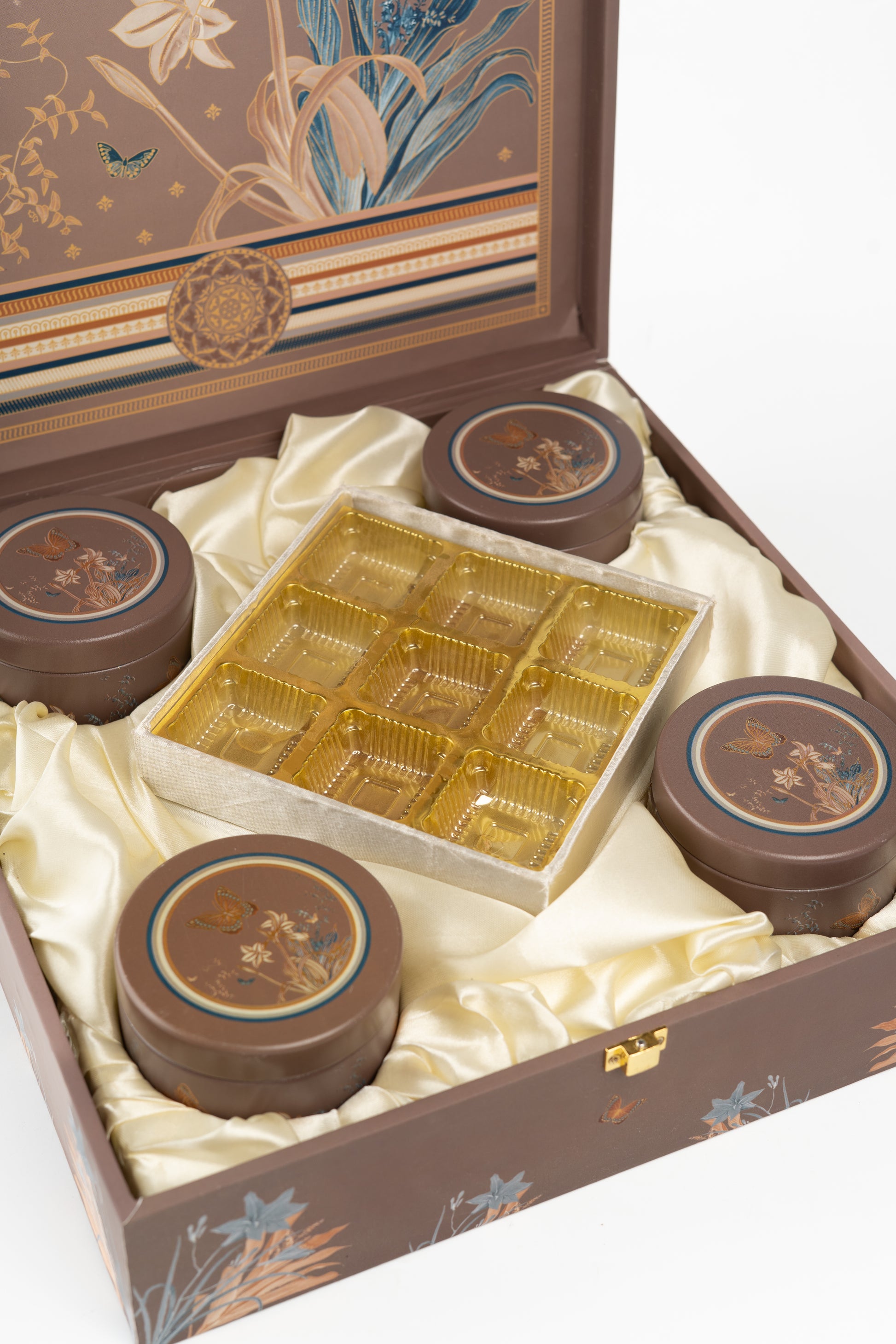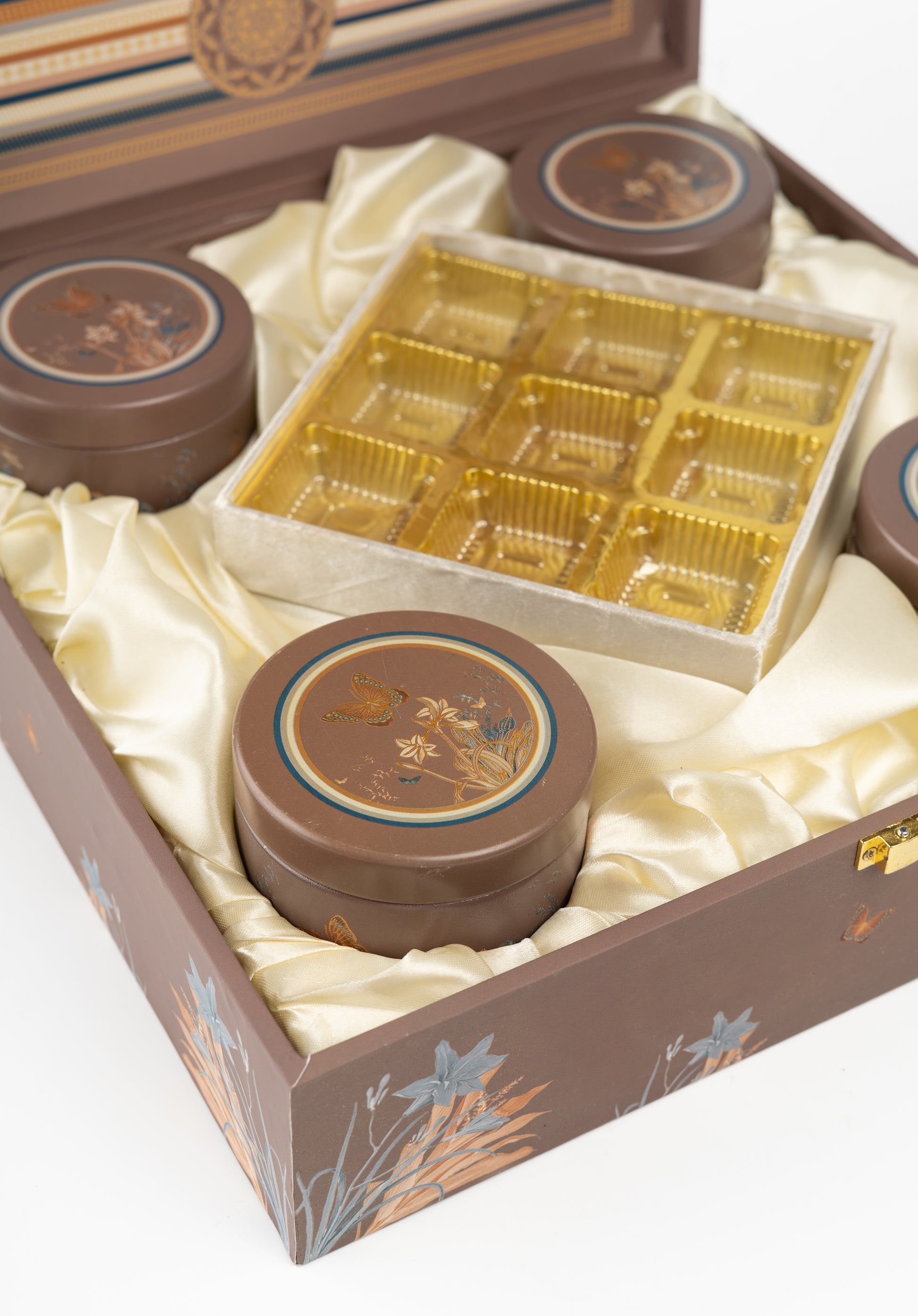 The satin-lined interior cradles four exquisitely crafted round tins, each decorated with floral and butterfly motifs, encircling a central golden tray perfect for housing confections or delicacies. All of this is enclosed in a sturdy, beautifully printed case with secure golden hardware—ideal for reuse as a keepsake box.