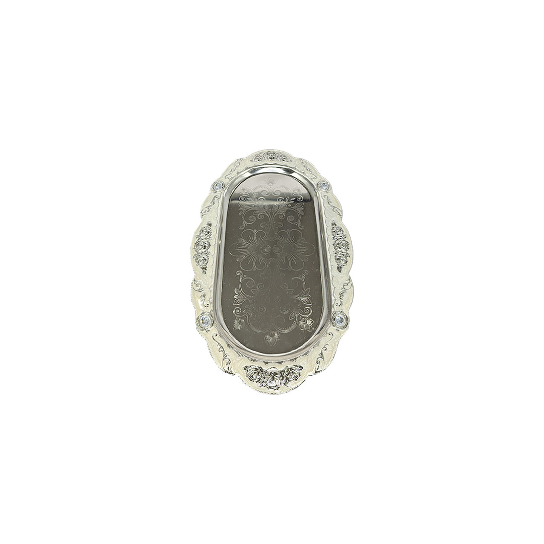 This exquisite Royal Floral Silver Plated Oval Tray is perfect for dining, pooja rituals, or gifting. Crafted in an elegant oval shape, it features intricate floral engravings and a classic border design that adds a royal charm to your décor. Whether you use it to serve dry fruits and sweets to guests or as a decorative piece, this tray makes every occasion special.