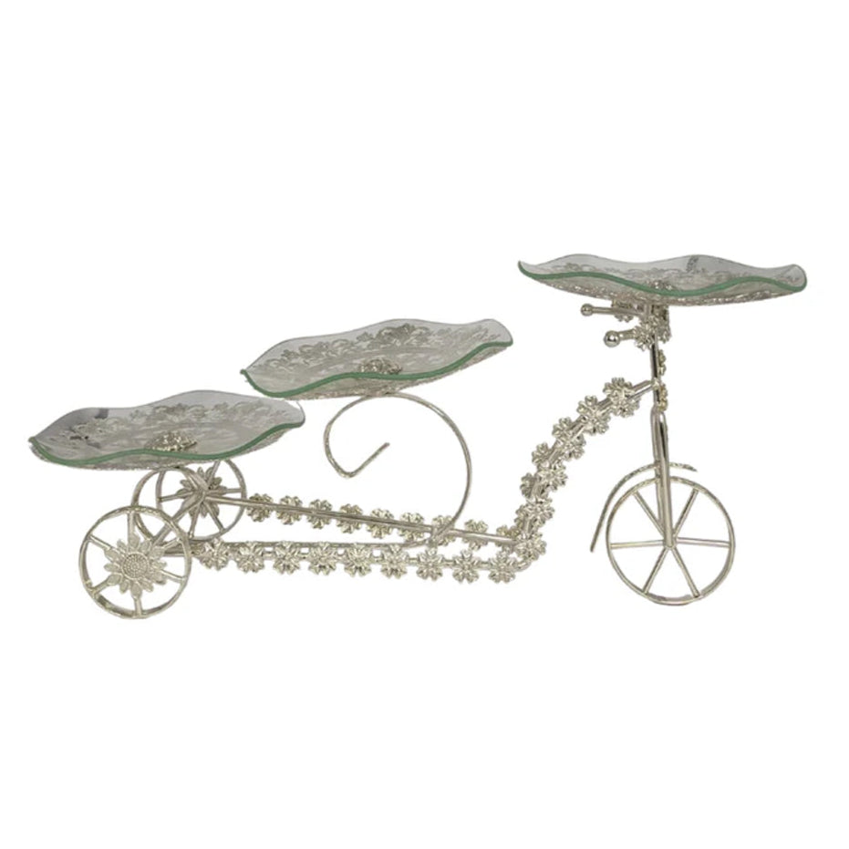 This Three Tier Victorian Tricycle Glass Tray Stand beautifully combines artistry and utility, making it a centerpiece for any gathering. Its bicycle-inspired frame, adorned with intricate floral designs, supports three delicately crafted glass trays, offering the perfect balance of charm and sophistication.