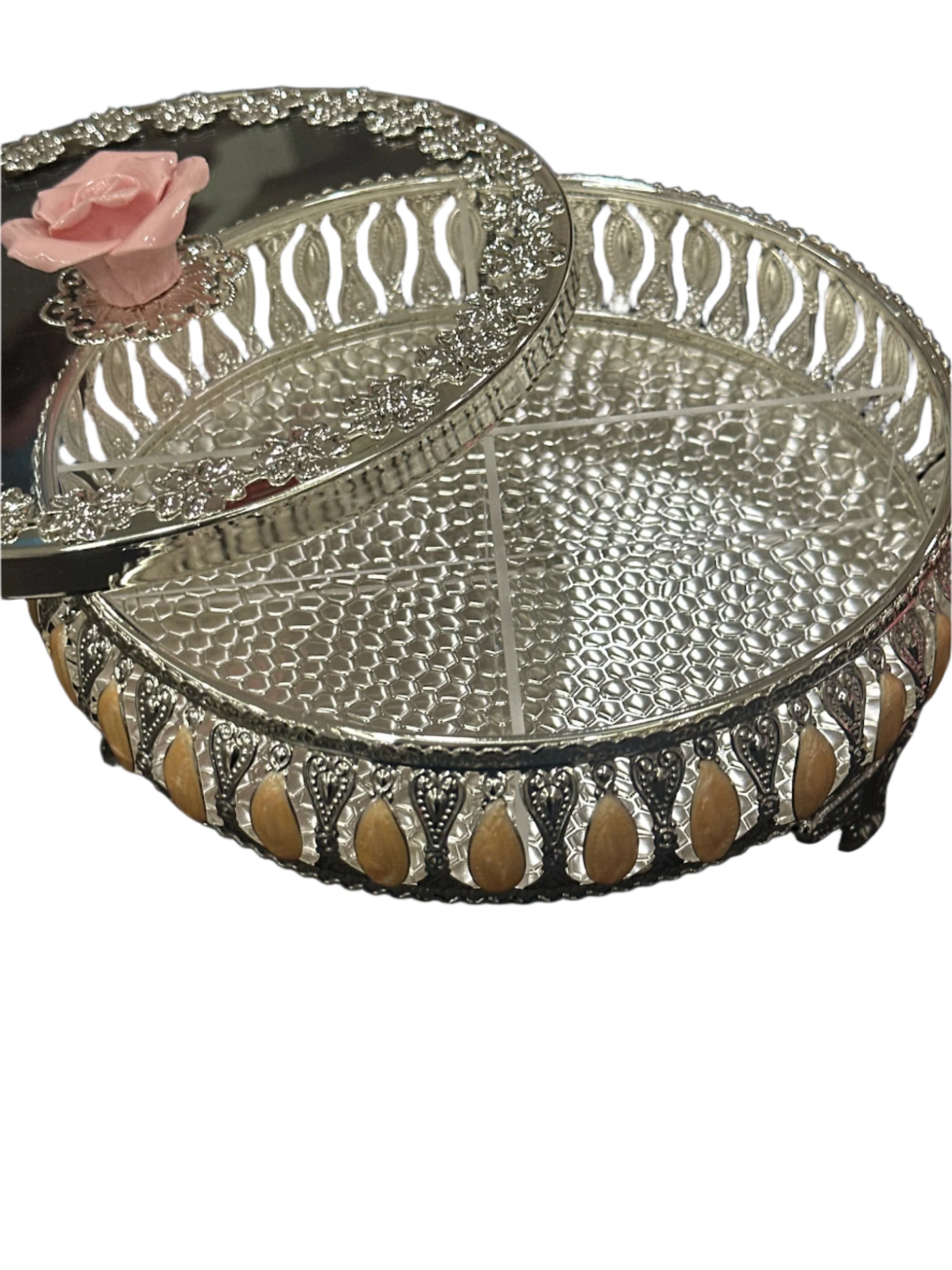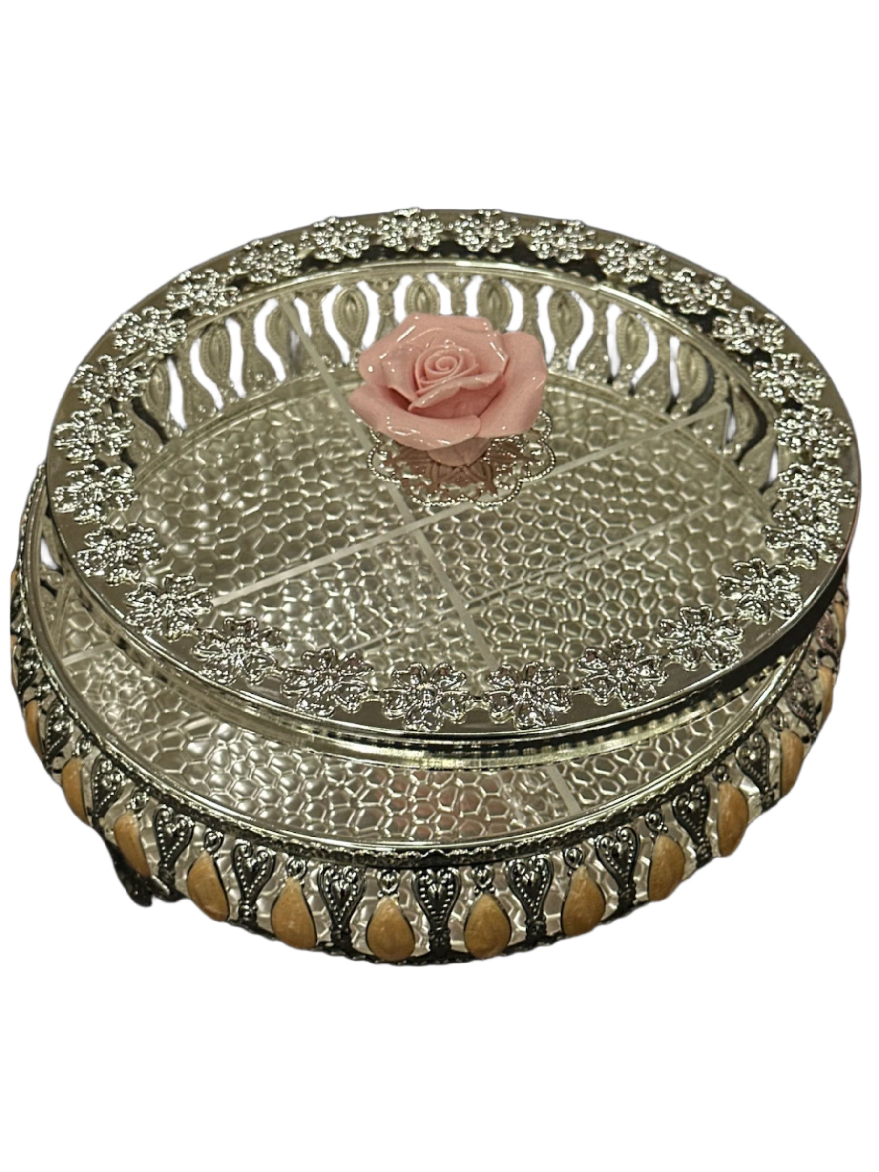 This Graceful Rose Silver Plated Four Partition Circular Box is a perfect blend of beauty and functionality, designed to showcase your treasures in a refined and sophisticated manner. The intricate silver-plated border, embellished with delicate floral motifs and detailed beading, surrounds the clear glass top that offers a view into the box's interior. At the center of the lid, a charming pink rose accent adds a subtle yet captivating touch of elegance, making this piece a perfect addition to any room or vanity.