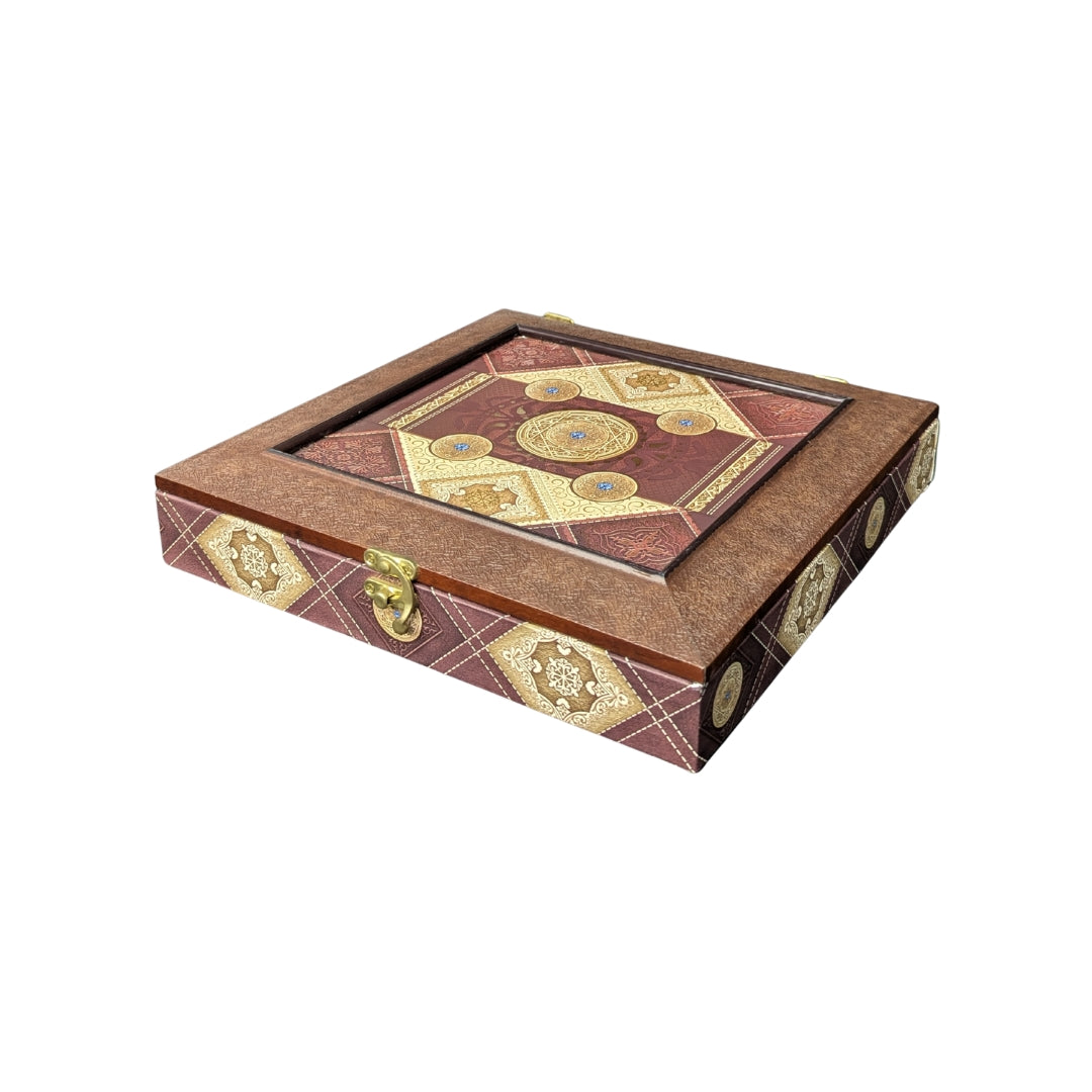 Elevate your gifting and organization with this luxurious Ethnic Pattern Wooden Box, crafted with rich traditional artwork and a radiant gold-finish interior. The exterior showcases an intricate ethnic pattern in warm maroon and gold tones, framed with a textured brown border for an elegant, premium look. A sturdy metal clasp secures the box, adding both function and vintage charm.
