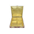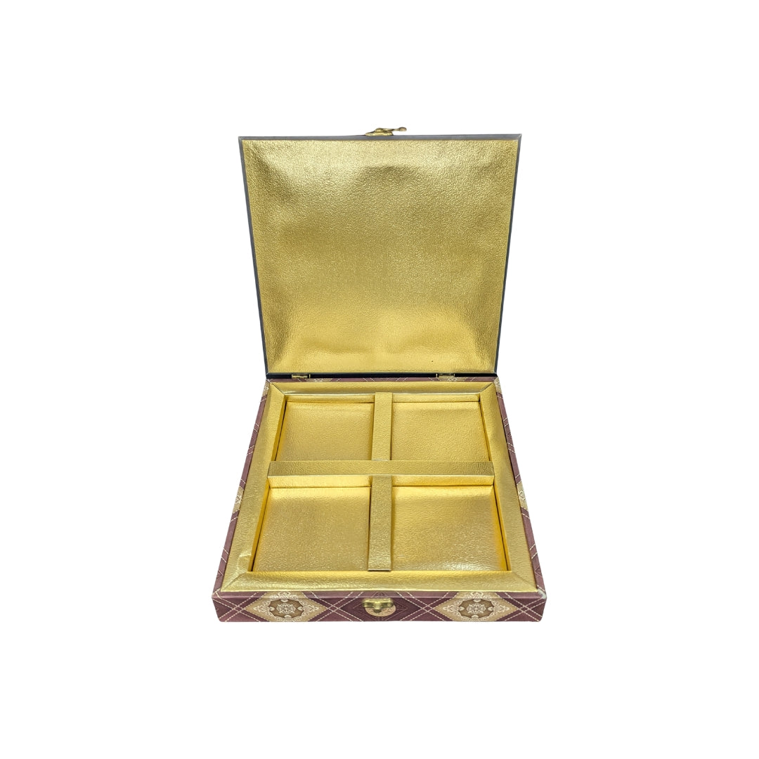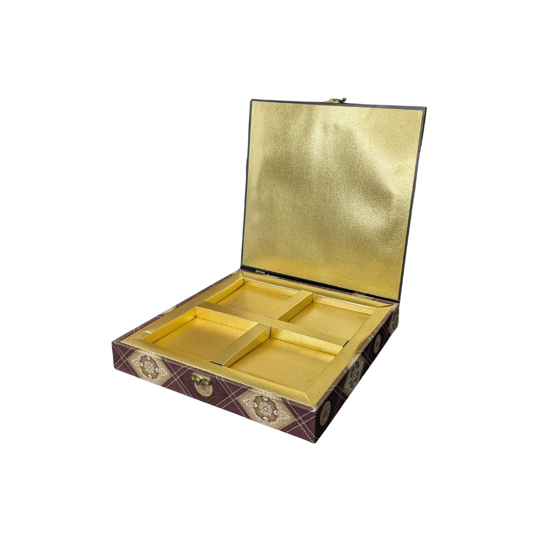 Inside, the box is lined with a shimmering gold surface and features four divided compartments—perfect for storing dry fruits, chocolates, jewelry, small accessories, or festive gift items. The box combines visual elegance with durable craftsmanship, making it ideal for special occasions, festive gifting, home décor, or personal use.