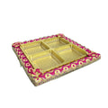Add charm and elegance to your festive servings with this Festive Golden Compartment Serving Tray. Designed with a luxurious golden four-compartment base, it is beautifully bordered with pink and golden fabric detailing, along with decorative knot embellishments at the corners. This tray is ideal for serving dry fruits, sweets, chocolates, or namkeen in style during festivals, weddings, and special occasions. It also makes for a thoughtful gifting option.