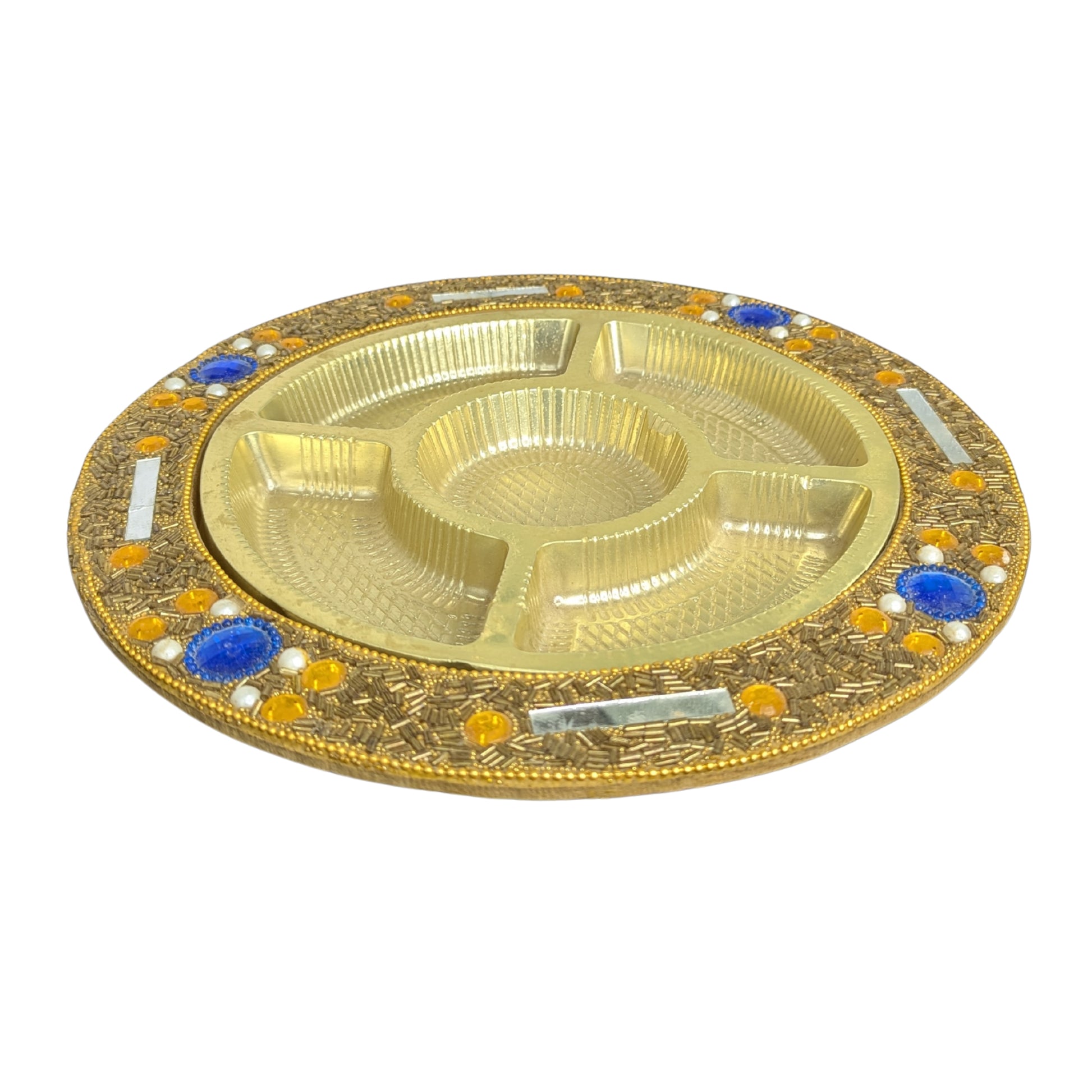 Add a royal touch to your serving style with this Round Decorative Golden 5 Compartment Serving Tray. Beautifully designed with intricate detailing, embedded blue and golden decorative stones, and a glossy golden finish, this tray is ideal for serving dry fruits, sweets, chocolates, or snacks during special occasions. The tray comes with 5 compartments (4 outer + 1 center), making it both functional and visually appealing. Perfect for festivals, weddings, family gatherings, and gifting purposes.