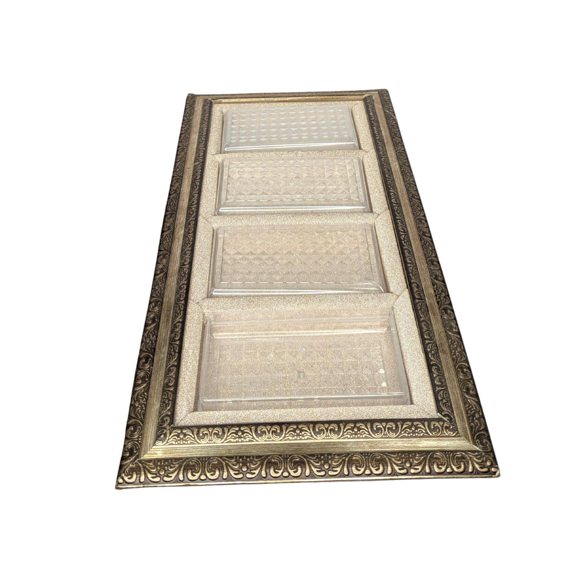 Enhance your serving style with this elegant Golden Rectangular Four Crystal Box Serving Tray, beautifully designed with a royal embossed border and a glossy golden finish. The tray features 4 spacious compartments, making it perfect for organizing and serving dry fruits, sweets, chocolates, namkeen, or snacks during festivals, family gatherings, or special occasions. Its premium look and durable build make it ideal for home use, festive celebrations, and gifting purposes.