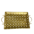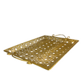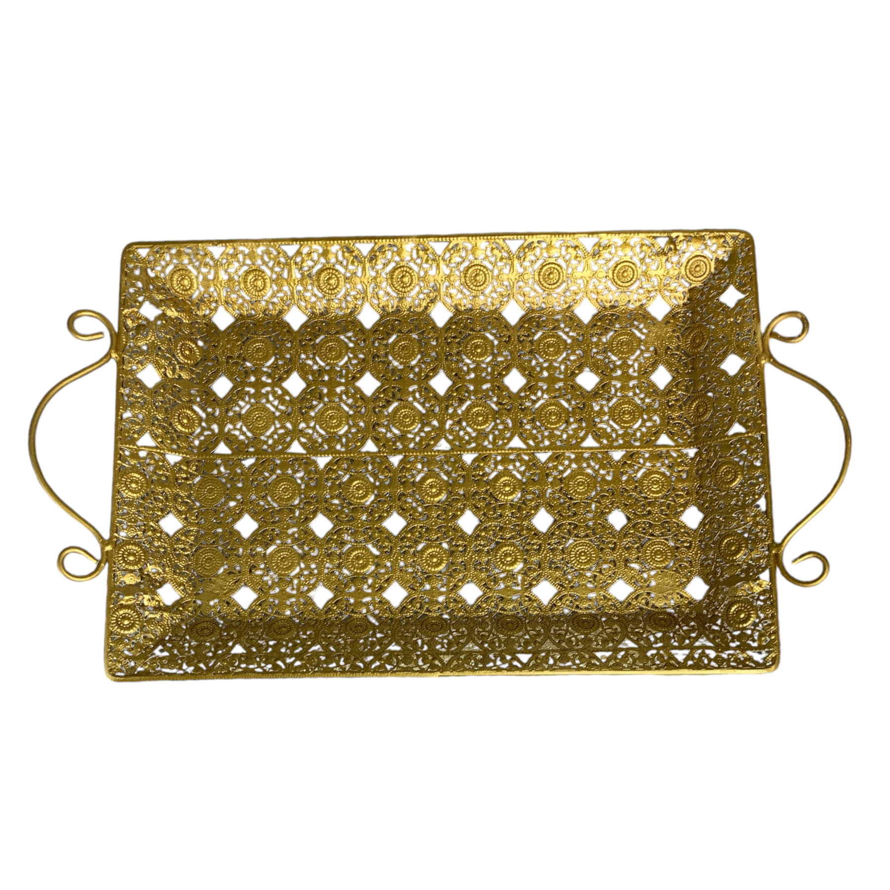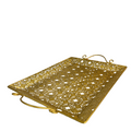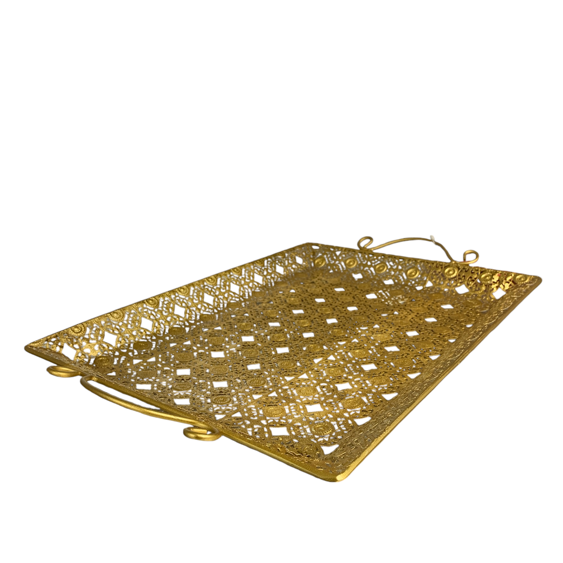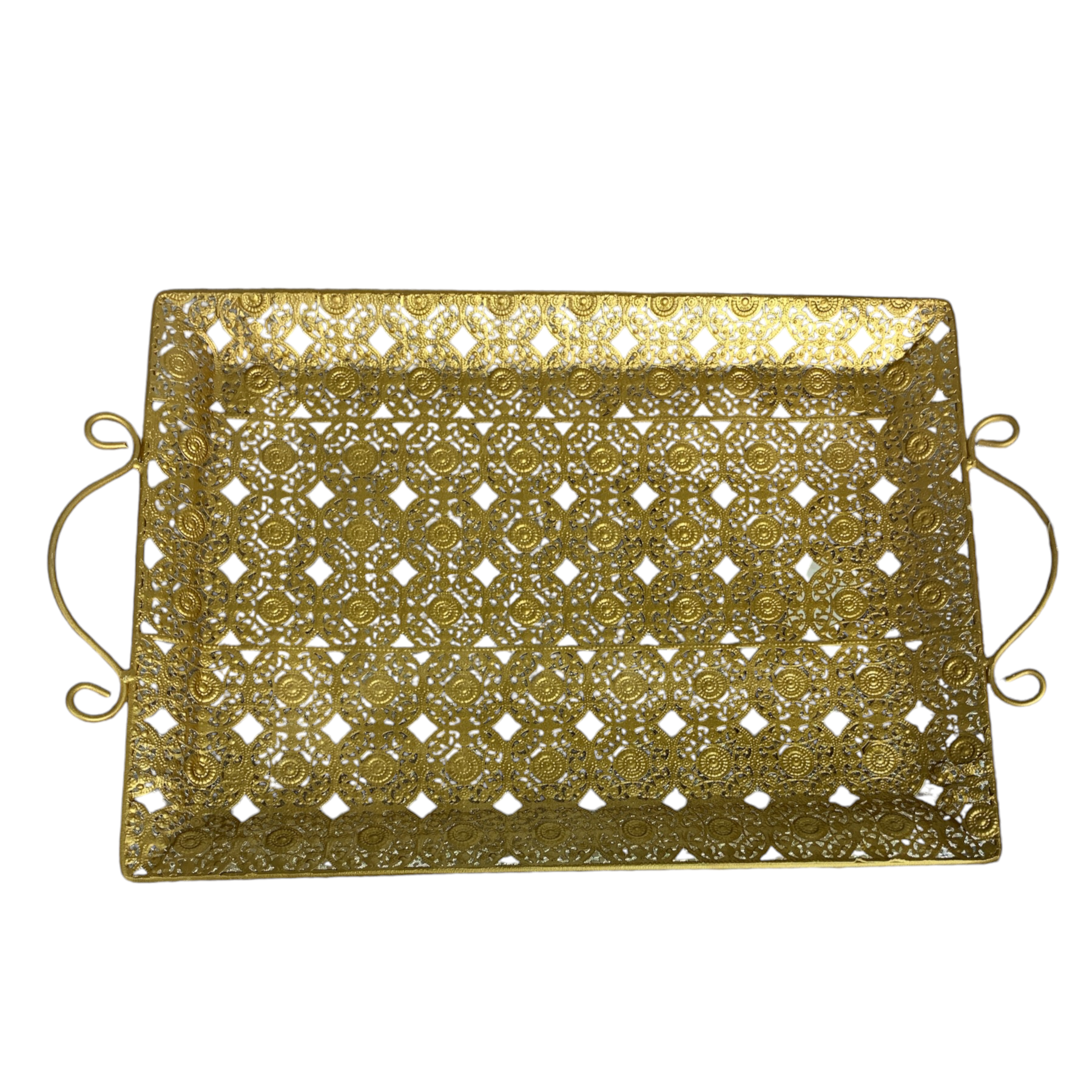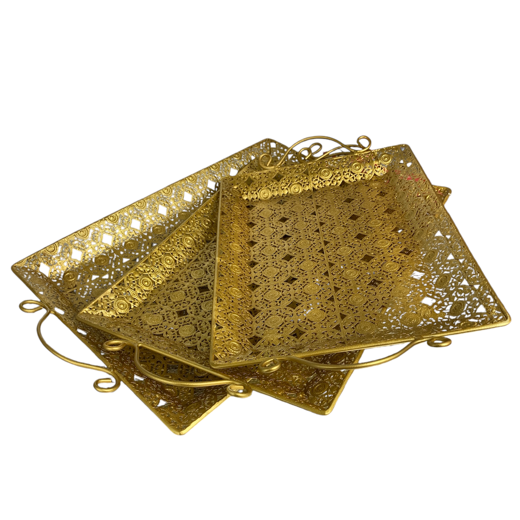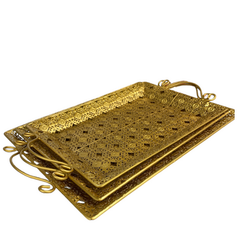 Add a touch of timeless elegance to your gatherings with the Regal Glow Gold Metal Serving Tray. This beautifully crafted trio features intricately cut-out floral and lattice patterns, finished in a luxurious golden hue that exudes opulence.