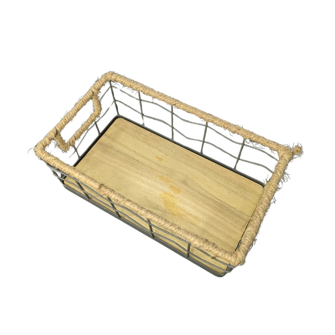 Its sturdy wire frame ensures durability, while the natural jute wrapping adds a touch of earthy elegance. The smooth wooden base provides stability and makes it suitable for holding a variety of items—from fruits, bread, and pantry essentials to books, toiletries, or decorative accents.