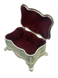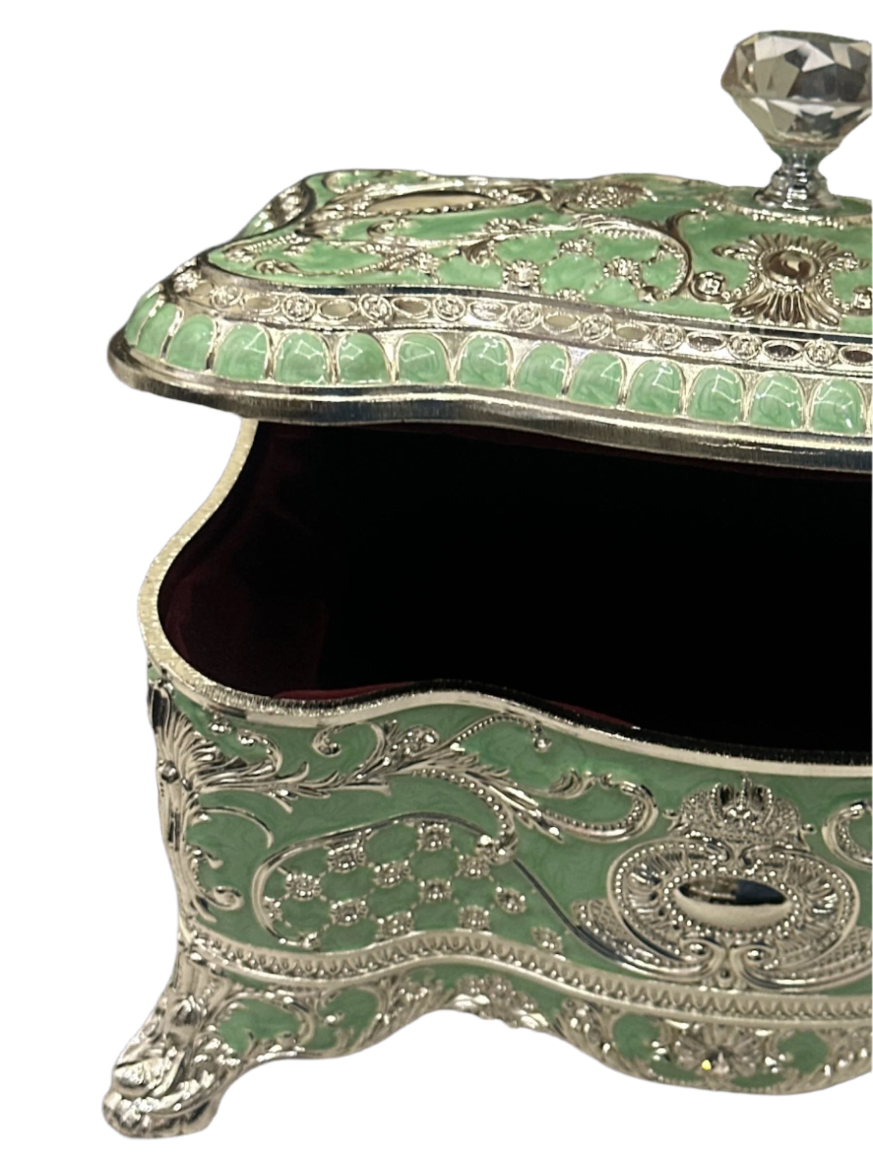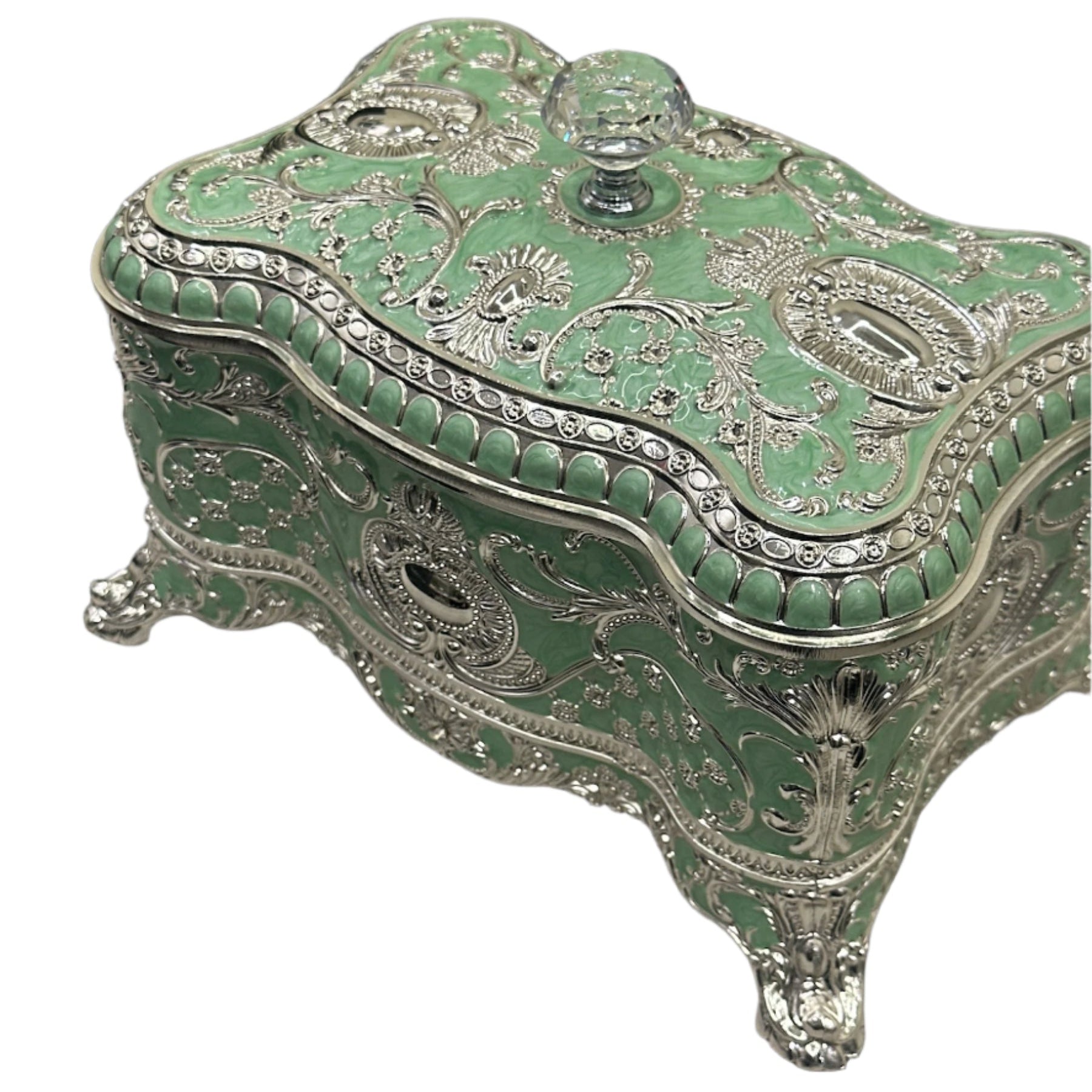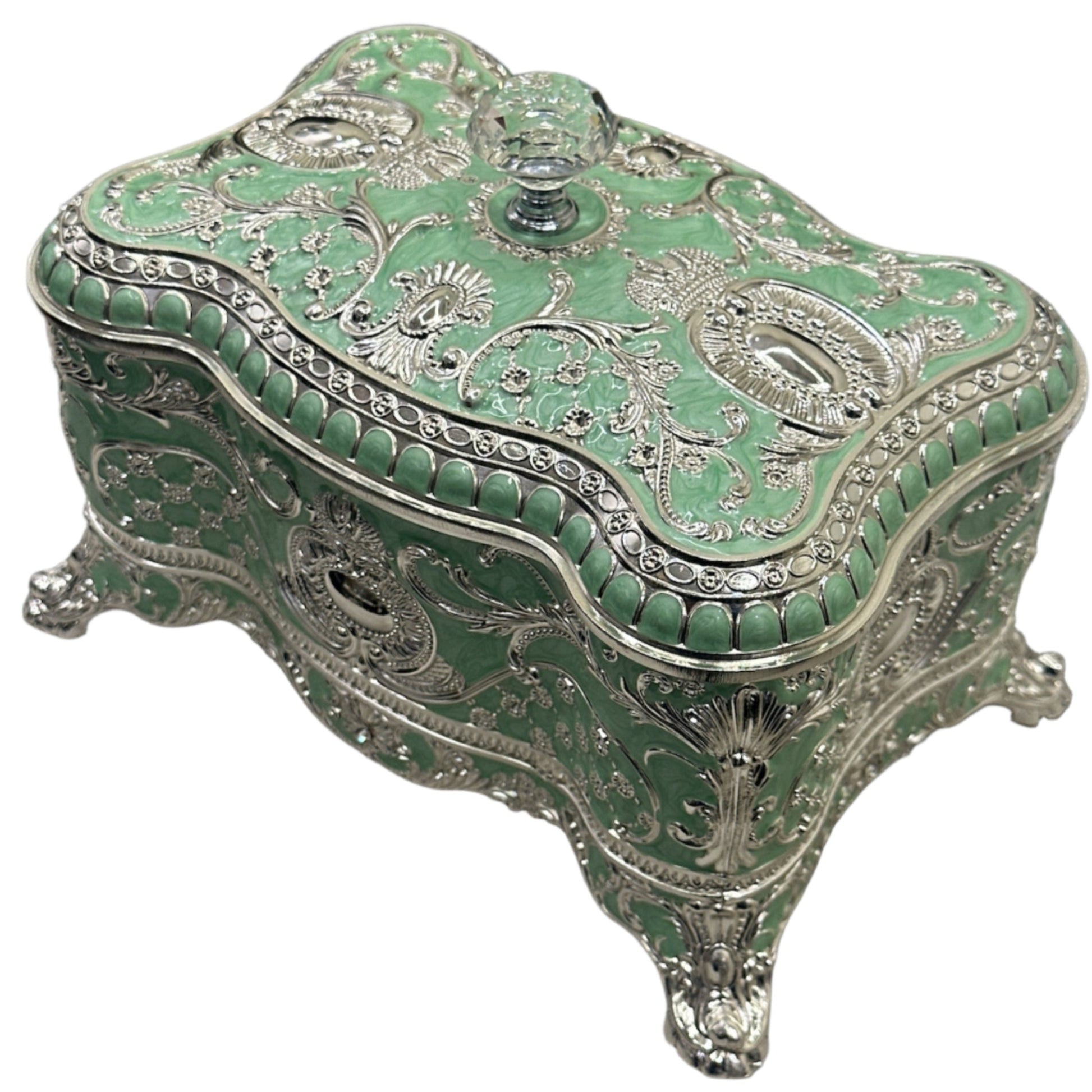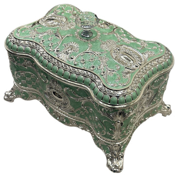 Add a touch of timeless elegance to your collection with this intricately designed Royal Rococo Velvet-Lined Trinket Box. Crafted with exquisite silver-tone detailing and adorned in soft green enamel, this decorative piece features ornate floral and scrollwork patterns inspired by Baroque and Rococo artistry.