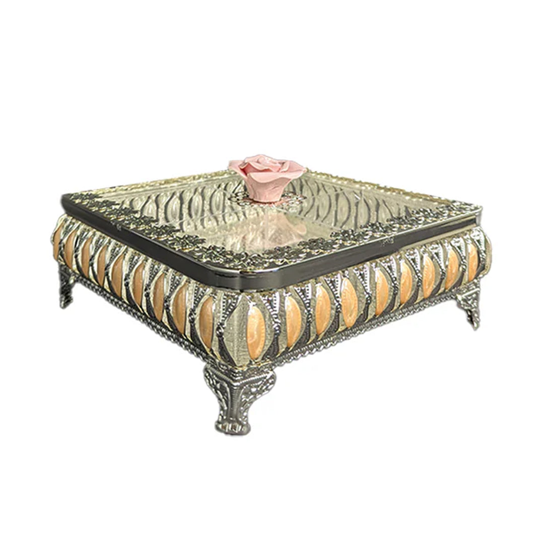 Designed with intricate detailing and a luxurious antique silver finish, this square-shaped metal box is both functional and ornamental. Its delicately carved patterns, complemented by a charming rose-shaped lid handle, make it an exquisite addition to your home dΓ©cor. Whether you use it to store jewelry, dry fruits, sweets, or as a stylish gift box, it is sure to impress with its royal charm.