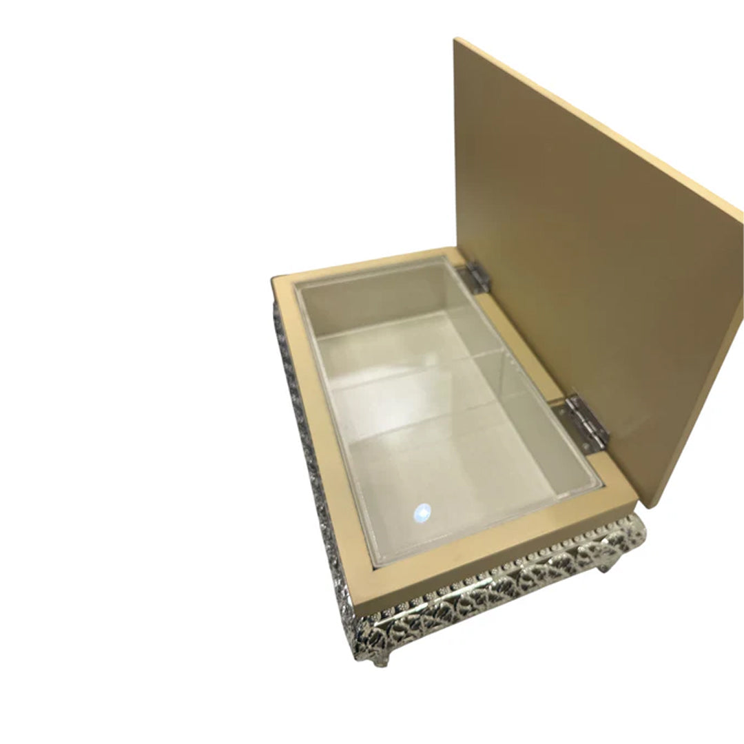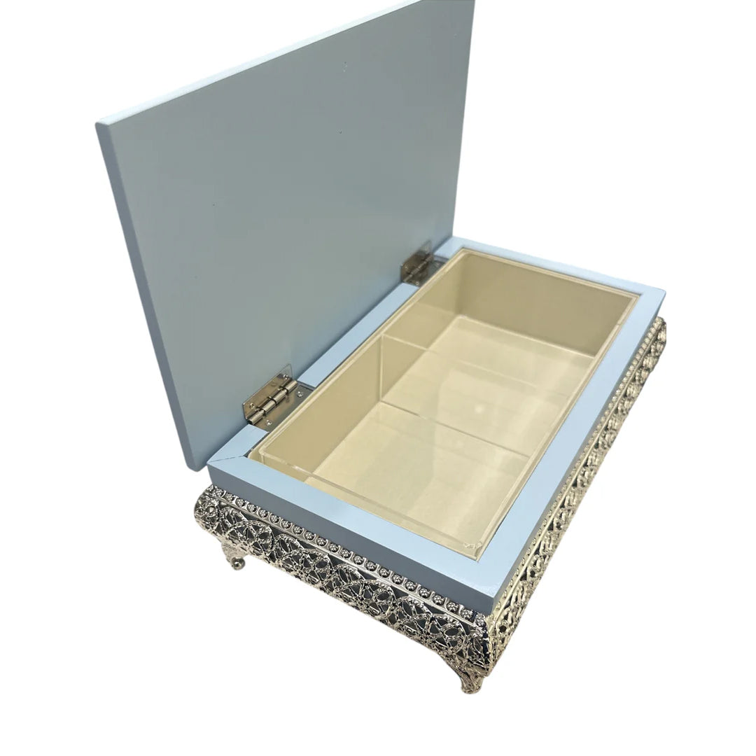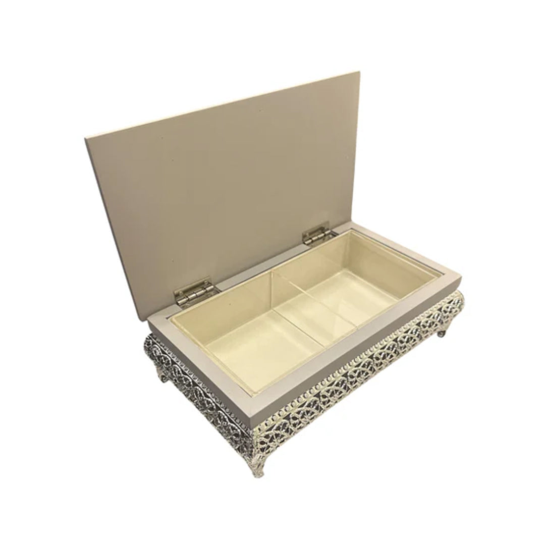 Inside, a velvet-lined compartment offers divided sections ideal for organising jewellery, trinkets, or keepsakes — making this box as functional as it is beautiful.