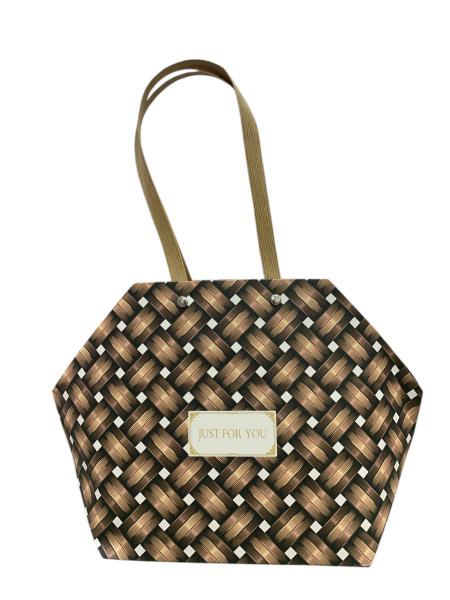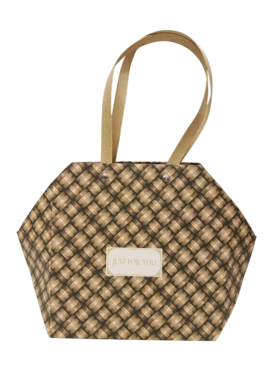 • Colour & Design: Brown woven basket-style print with “Just for You” label