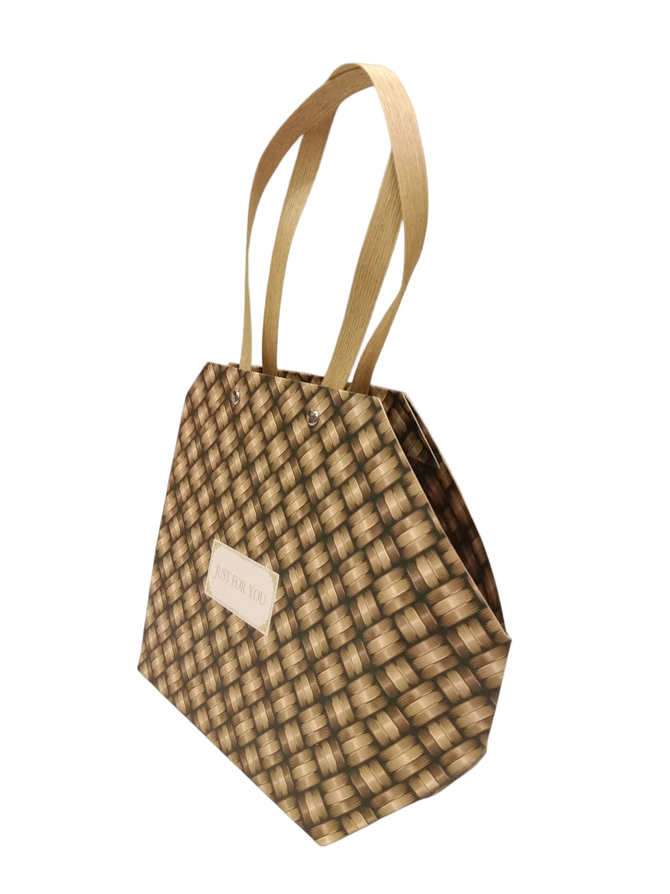 Make your gifts stand out with this Basket Print Hexagon Paper Bag, designed to impress with both style and durability. Featuring a unique hexagonal shape and a realistic woven basket-style print, this bag combines traditional charm with modern elegance. The sturdy construction ensures safe carrying, while the premium ribbon handles add a touch of sophistication.
