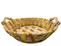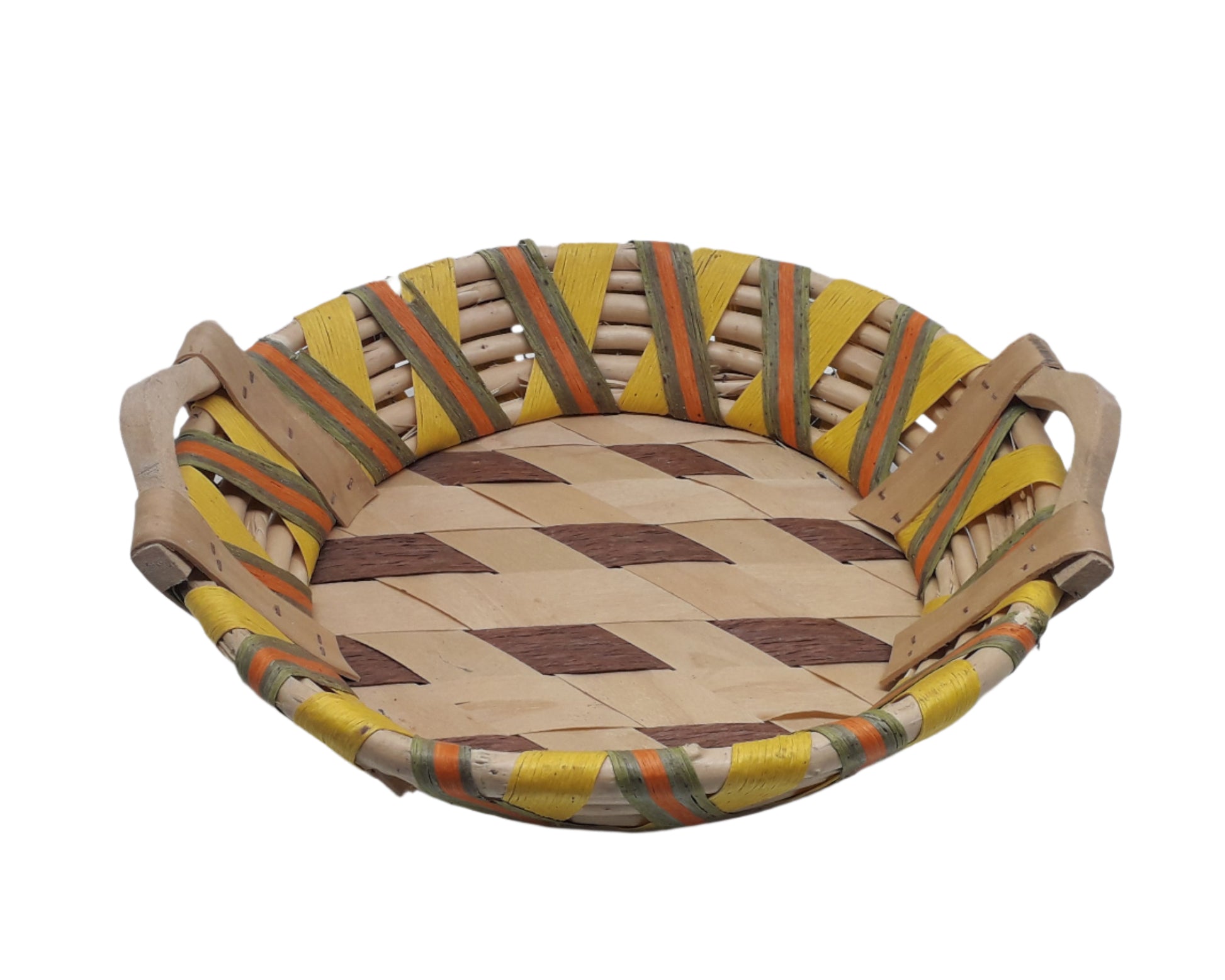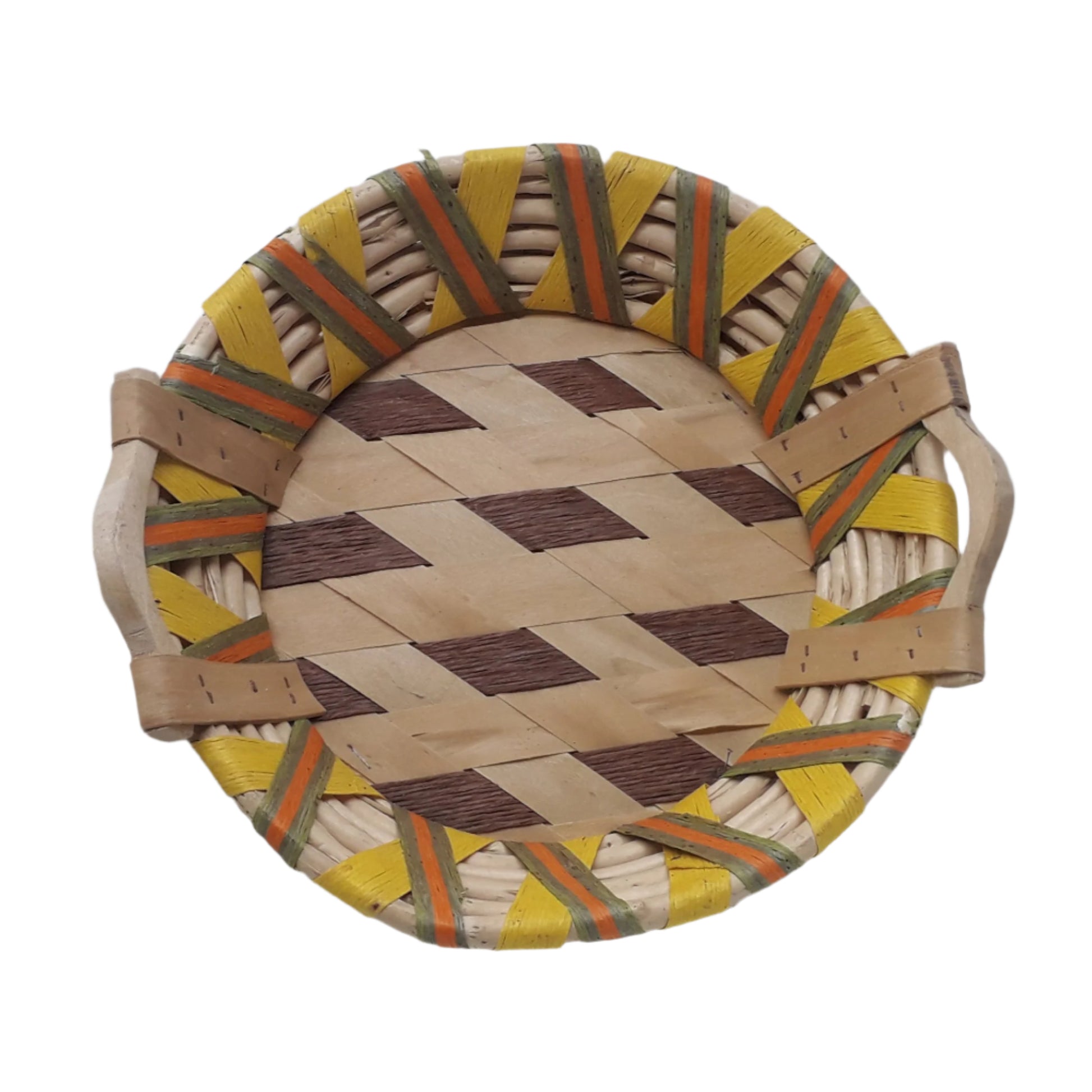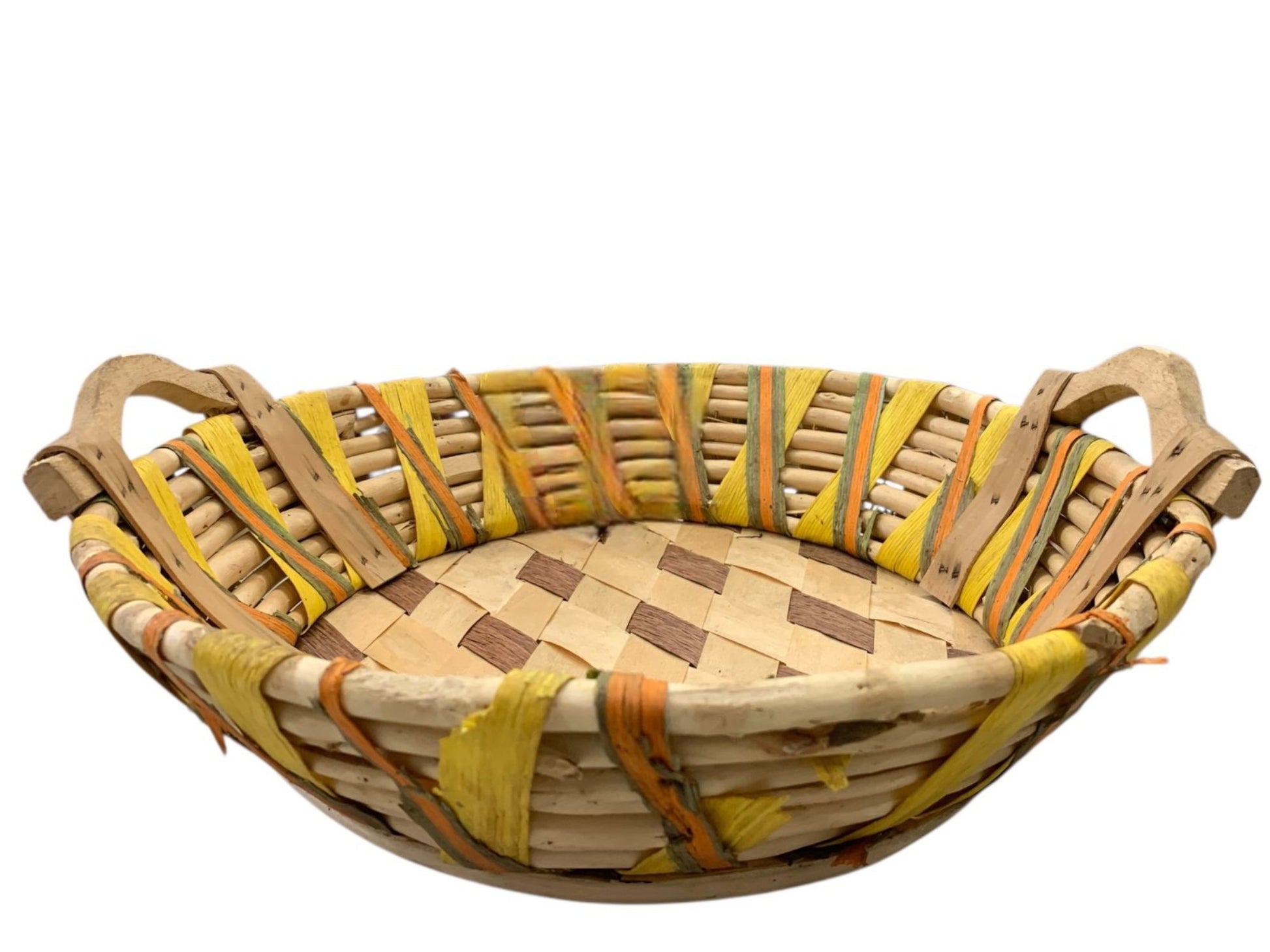 Brighten up your home with this Colourful Bamboo Basket with Wooden Handles, featuring a lively combination of yellow, orange, and green accents woven over natural bamboo. The sturdy wooden handles add both style and functionality, making it perfect for serving bread, fruits, or snacks, as well as for decorative storage.
