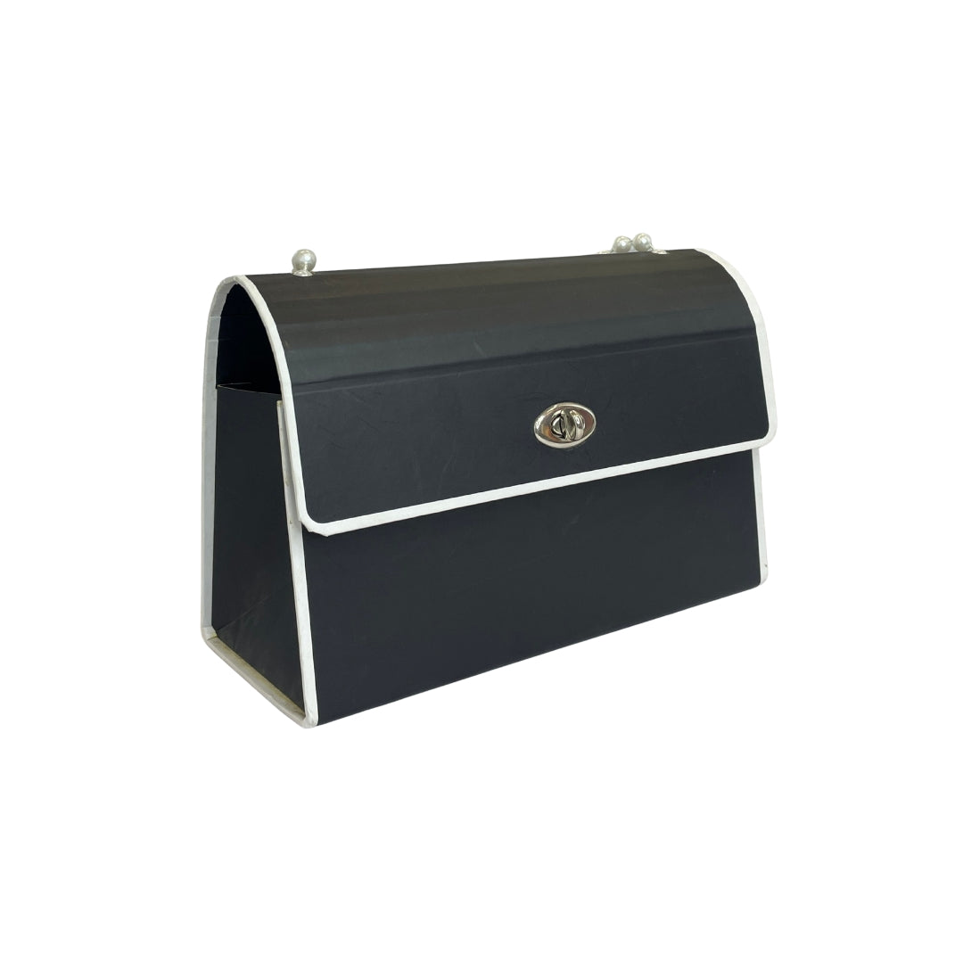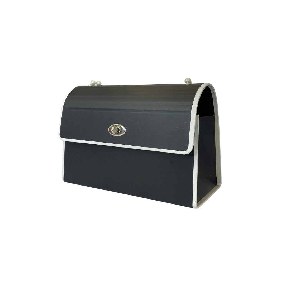 Its sleek black exterior, contrasted with white edging, gives it a chic and modern look. The metallic twist-lock closure enhances both security and style, making it perfect for luxury gifting experiences. Whether you're presenting jewelry, chocolates, dry fruits, accessories, cash gifts, or festive hampers, this handbag gift box ensures your gift stands out in the most memorable way.