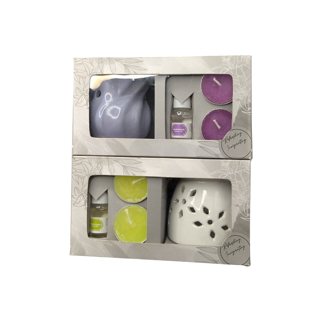 Create a calming and refreshing ambience with this Ceramic Oil Diffuser Gift Set. Each set comes with a stylish ceramic diffuser, a bottle of fragrance oil, and tealight candles—everything you need to start your aromatherapy session instantly.