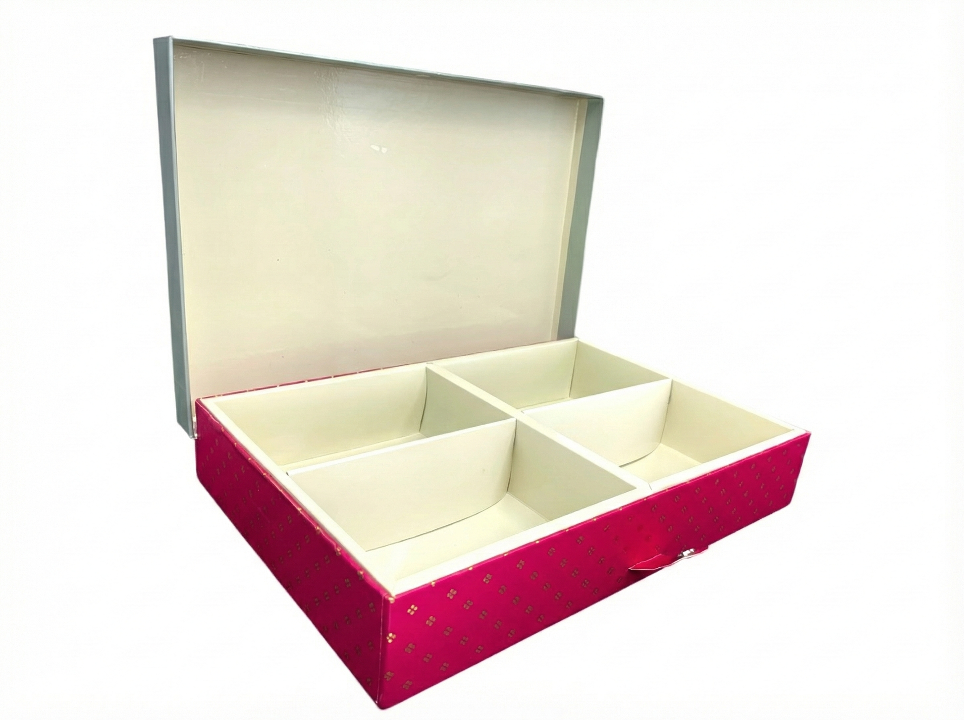 Elevate your gifting experience with this beautifully crafted Floral Design Gift Box with Four Partitions, featuring a premium rigid design and an elegant floral-printed lid. The box combines style with functionality, making it perfect for festive occasions, celebrations, corporate gifting, or personal use. Its sturdy exterior and neatly designed interior partitions ensure your items stay secure, organized, and visually appealing.