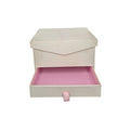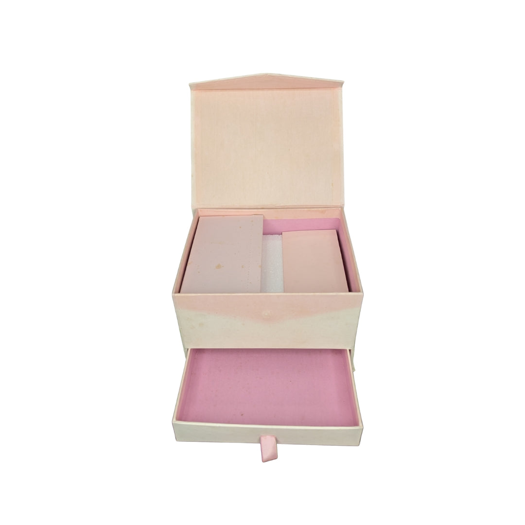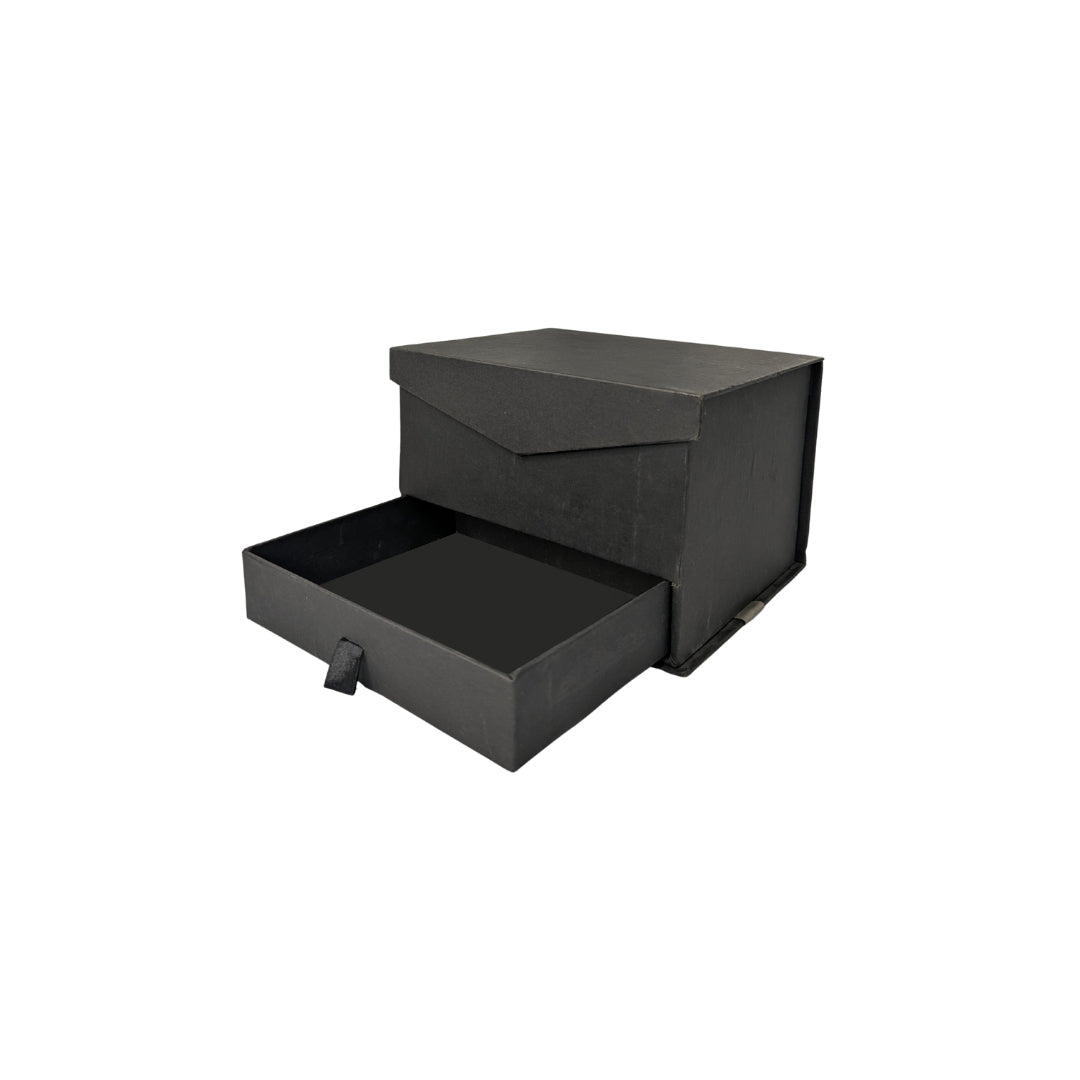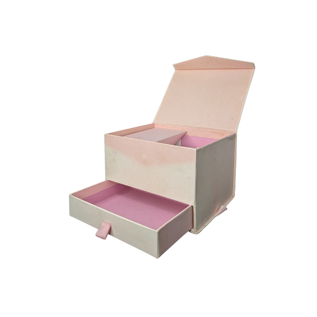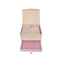 The lift-top lid opens to reveal a spacious interior featuring thoughtful compartment dividers—perfect for arranging gifts such as accessories, perfumes, gourmet items, or personal keepsakes. Below, a smooth slide-out drawer provides additional storage, enhancing the box’s versatility and charm.