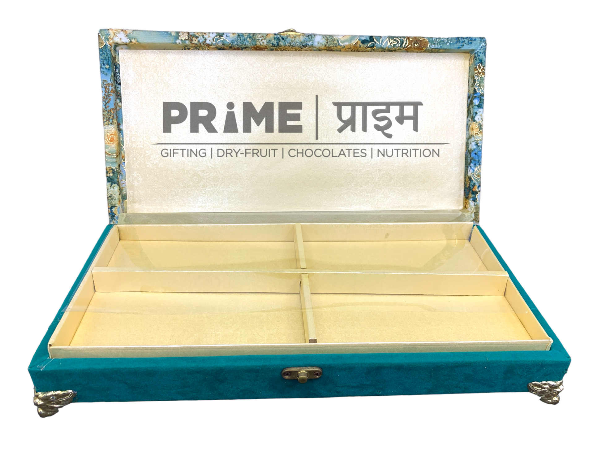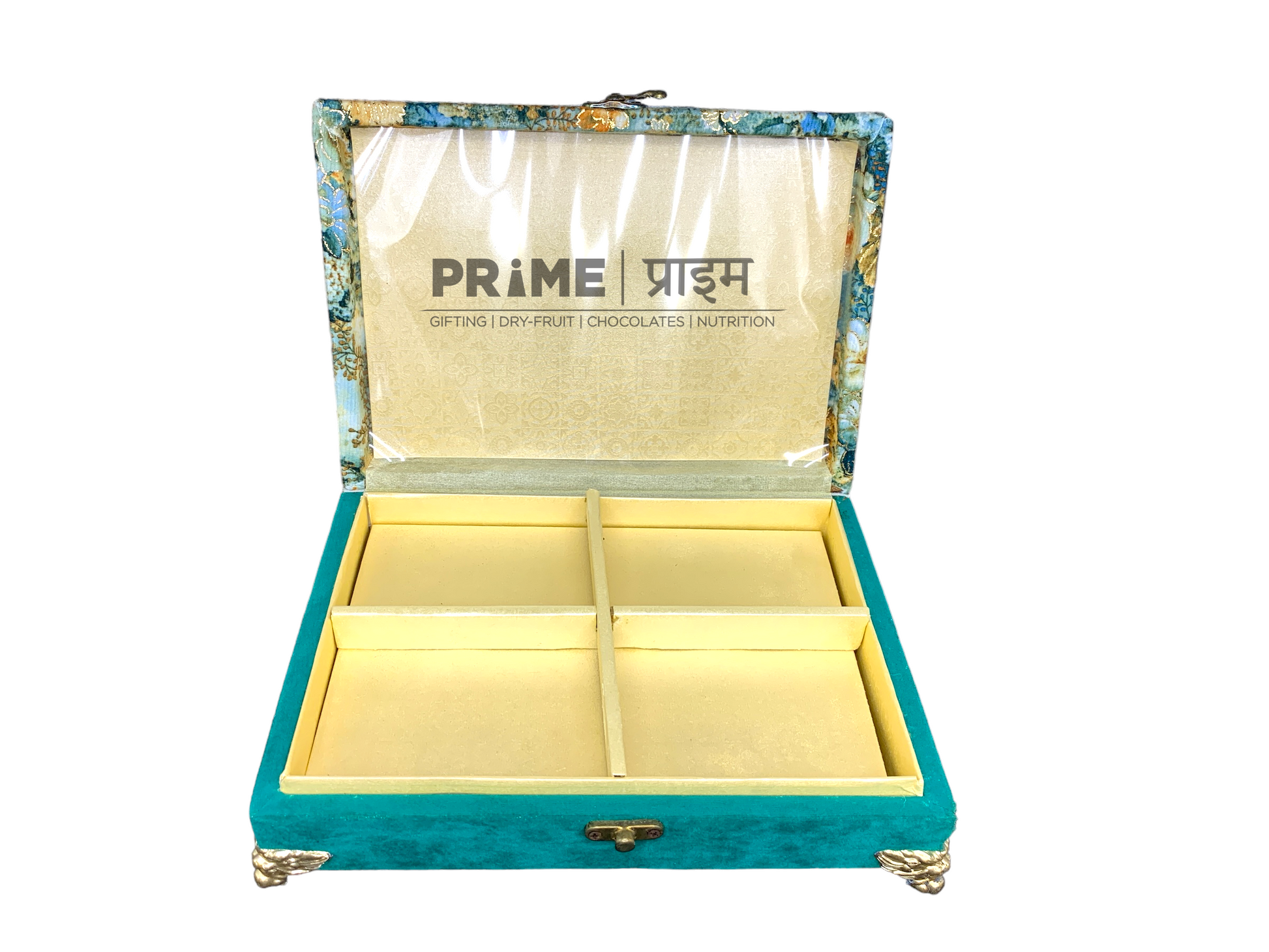 Inside, the box includes a 4-section golden partition tray—perfect for organizing dry fruits, chocolates, sweets, mukhwas, or assorted festive hampers. The transparent lid allows the contents to be displayed elegantly while keeping them protected. Sturdy golden metal legs enhance its premium presence, making it a centerpiece-worthy gifting choice.